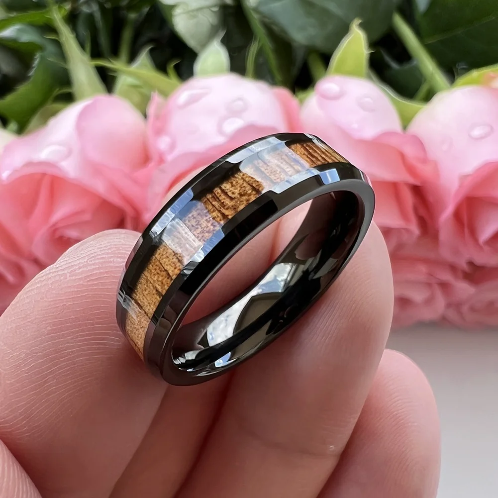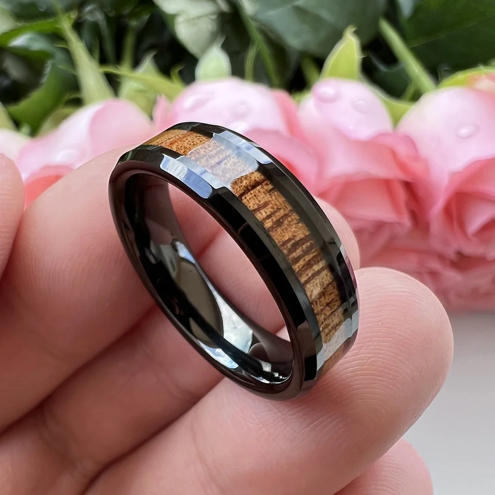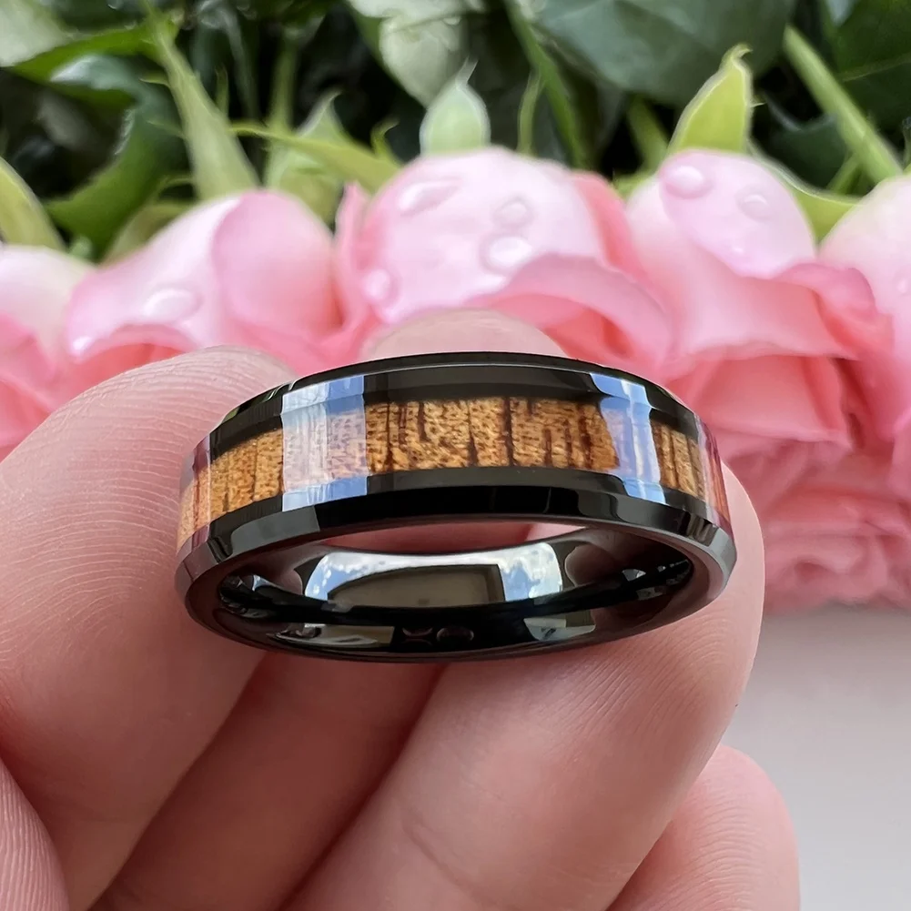 Coolstyle Jewelry 6mm Black Tungsten Finger Ring for Men Women Engagement Wedding Band Koa Wood Inlay Polished Comfort Fit