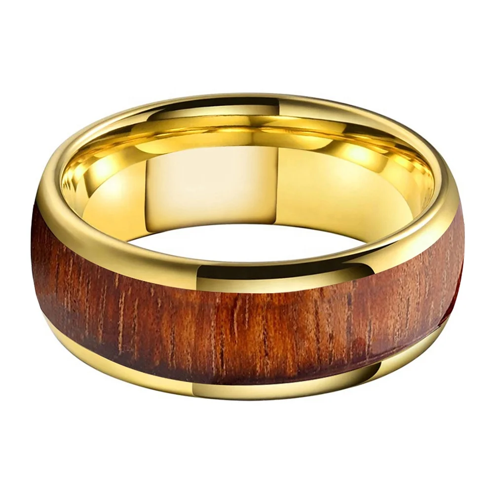 Coolstyle Jewelry 8mm Gold Tungsten Carbide Ring for Men Women Fashion Engagement Wedding Band Koa Wood Inlay Comfort Fit