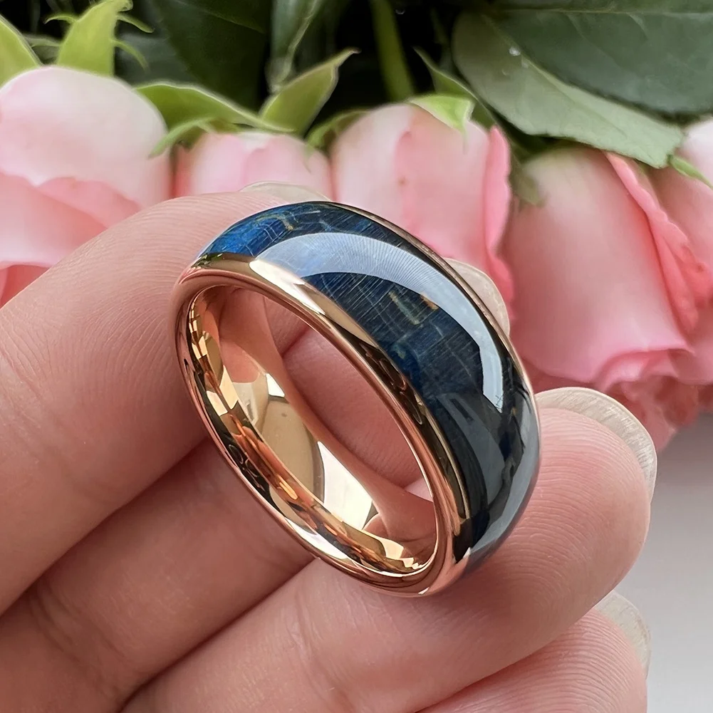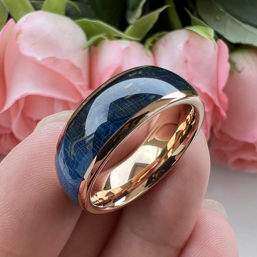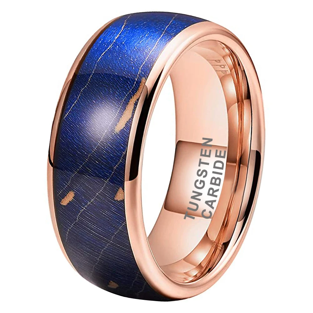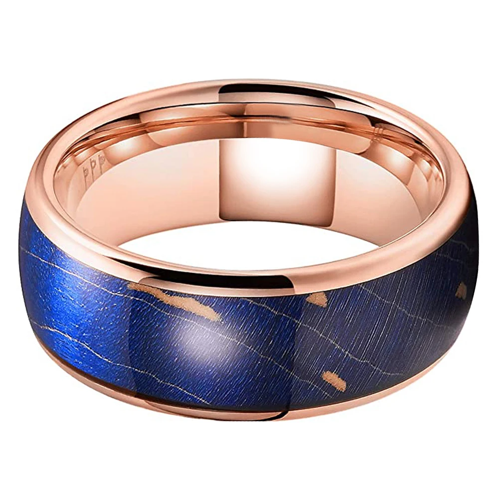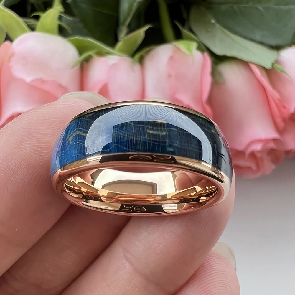 Coolstyle Jewelry 8mm Rose Gold Tungsten Ring for Men Women Wedding Band Blue Dyed Elder Wood Inlay Domed Polished Comfort Fit