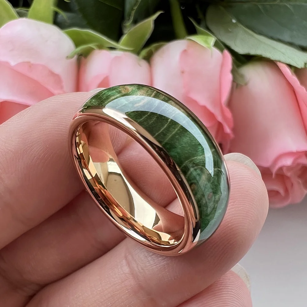 Coolstyle Jewelry 8mm Rose Gold Tungsten Ring for Men Women Wedding Band Green Dyed Elder Wood Inlay Domed Polished Comfort Fit