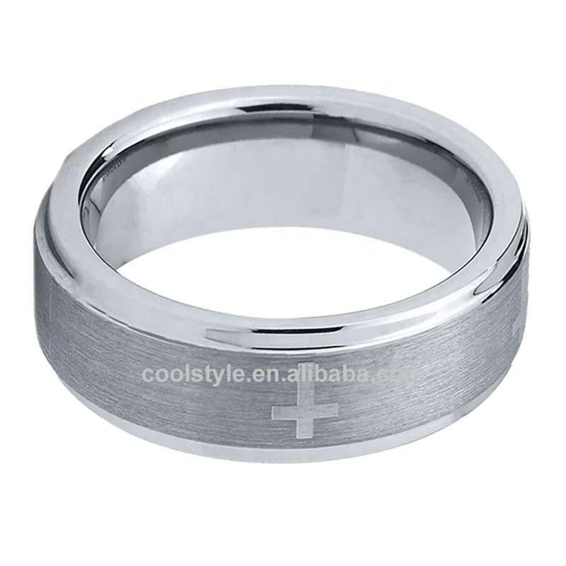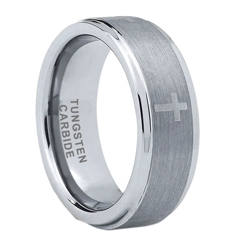 Coolstyle Jewelry 8mm Tungsten Ring for Men Women Engagement Band With 4 Crosses Engraved Stepped Brushed Finish Comfort Fit
