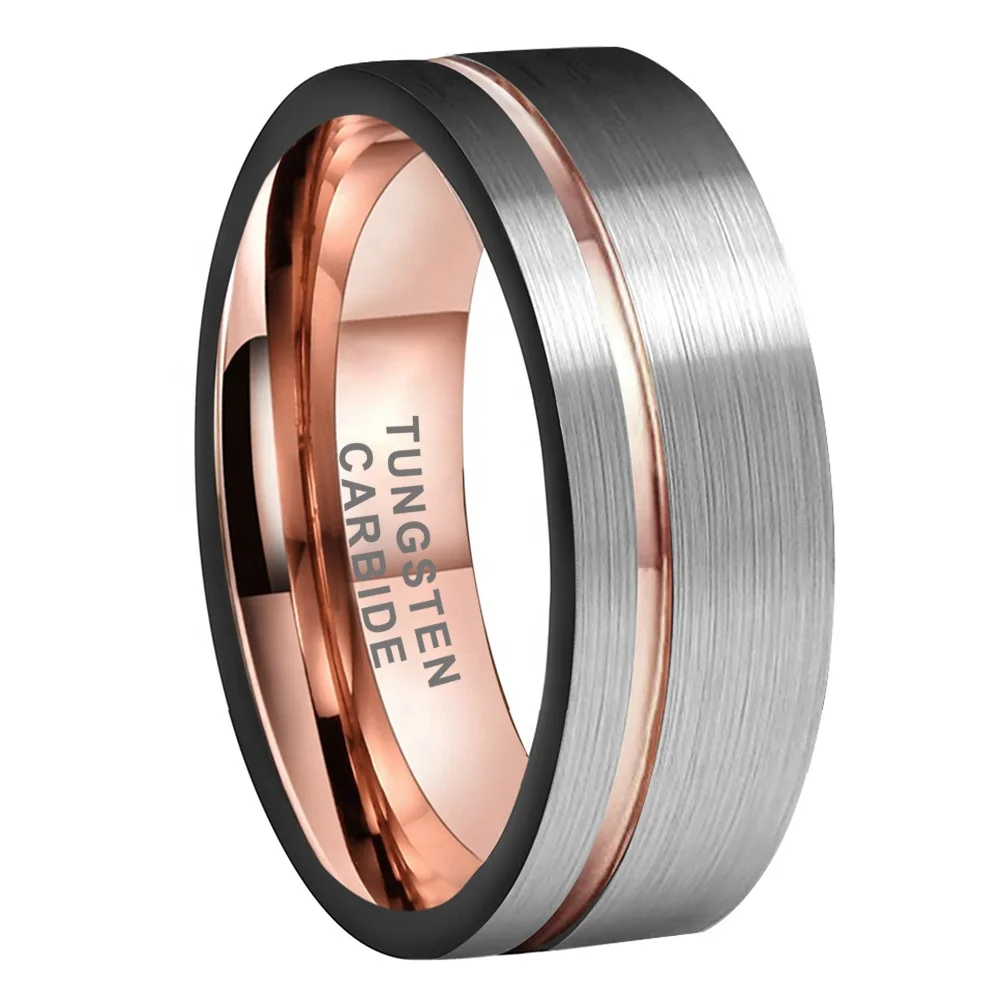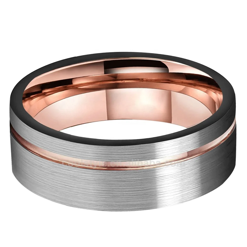 Coolstyle Jewelry 8mm Black Rose Gold Tungsten Ring for Men Women Engagement Band Offset Line Pipe Cut Brushed Comfort Fit