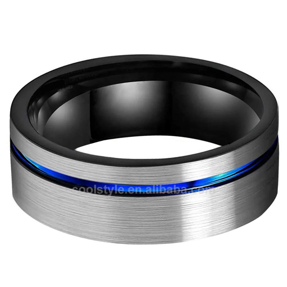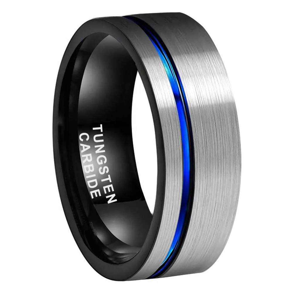 Coolstyle Jewelry 8mm Black Blue Tungsten Ring Wedding for Men Women Engagement Band Offset Line Pipe Cut Brushed Comfort Fit