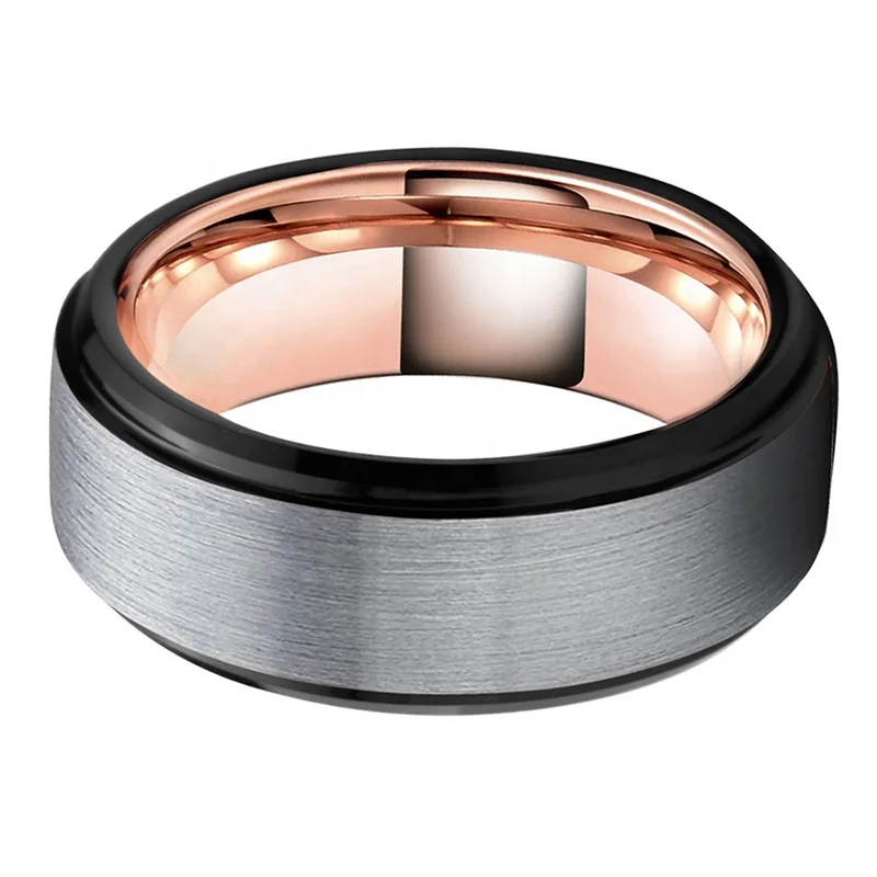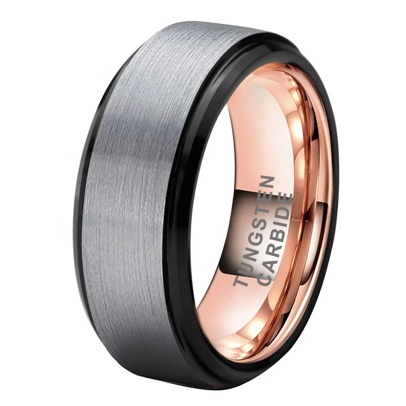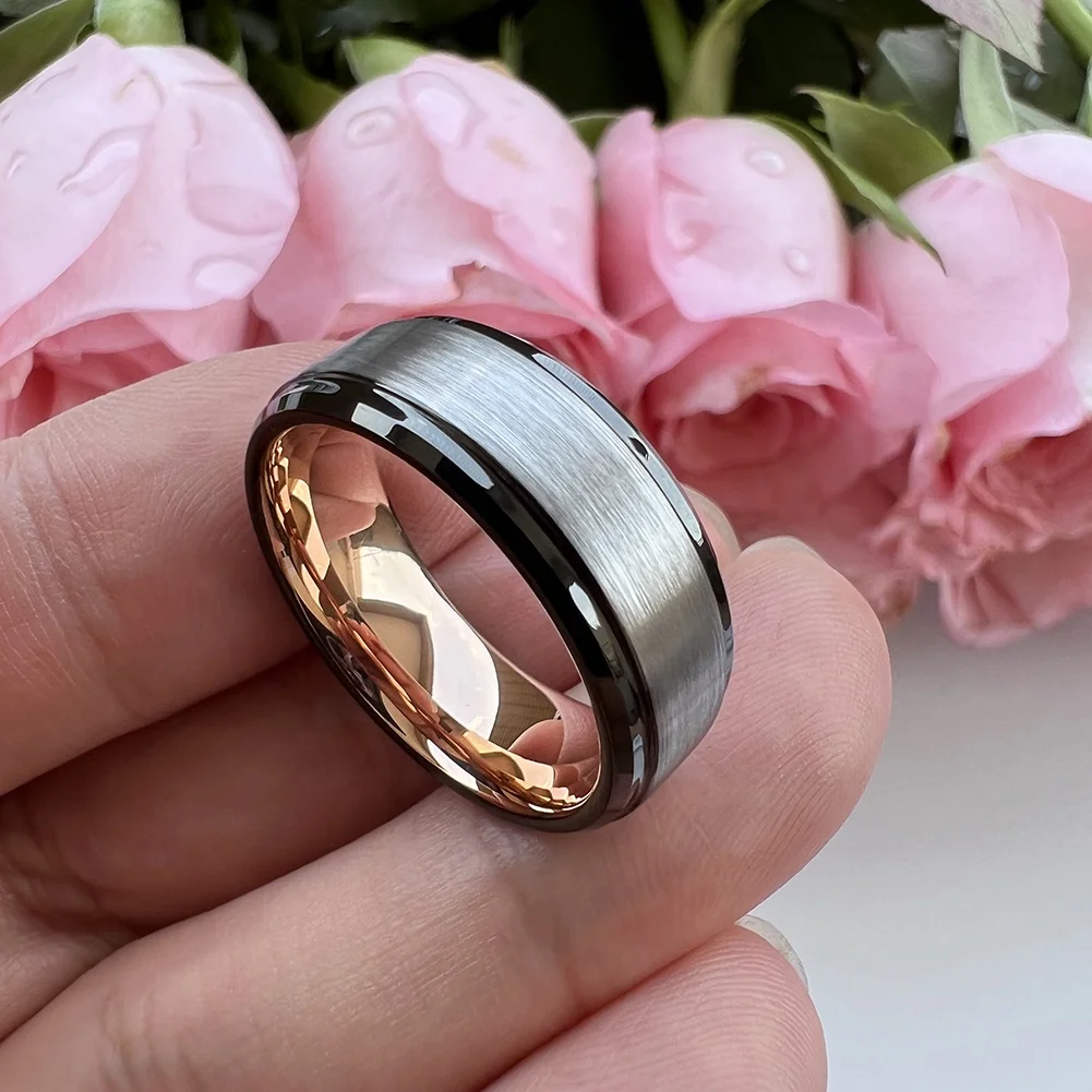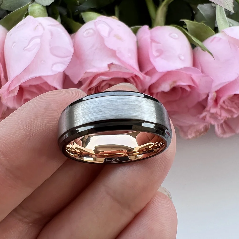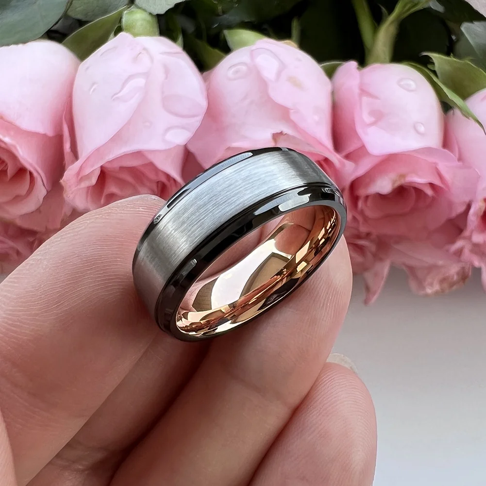 Coolstyle Jewelry 8mm Black Rose Gold Silver Top Polished Beveled Stepped Tungsten Ring for Men Women Wedding Band Comfort Fit