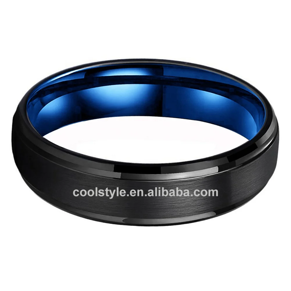 Coolstyle Jewelry 6mm Blue Black Tungsten Carbide Ring for Men Women Engagement Band Brushed Beveled Stepped Edges Comfort Fit
