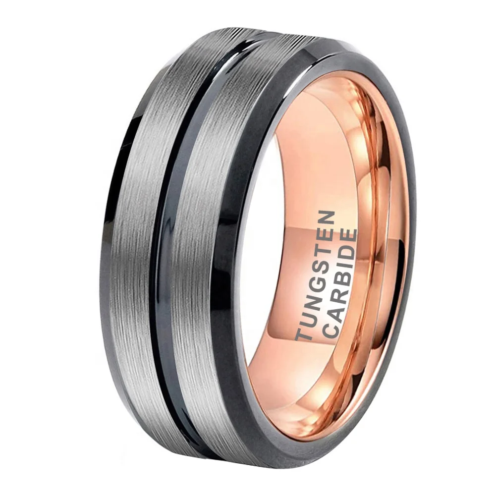 Coolstyle Jewelry 8mm Black Rose Gold Tungsten Ring for Men Women Engagement Band Beveled Edges Grooved Brushed Comfort Fit