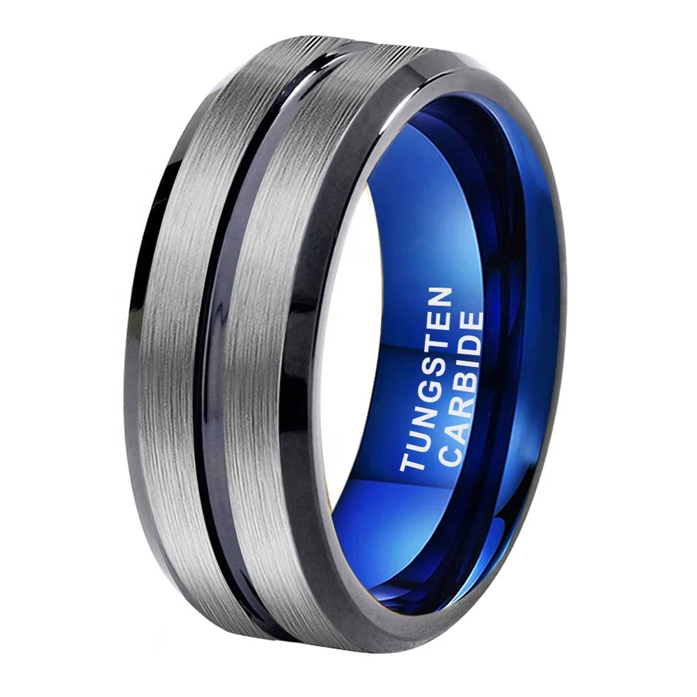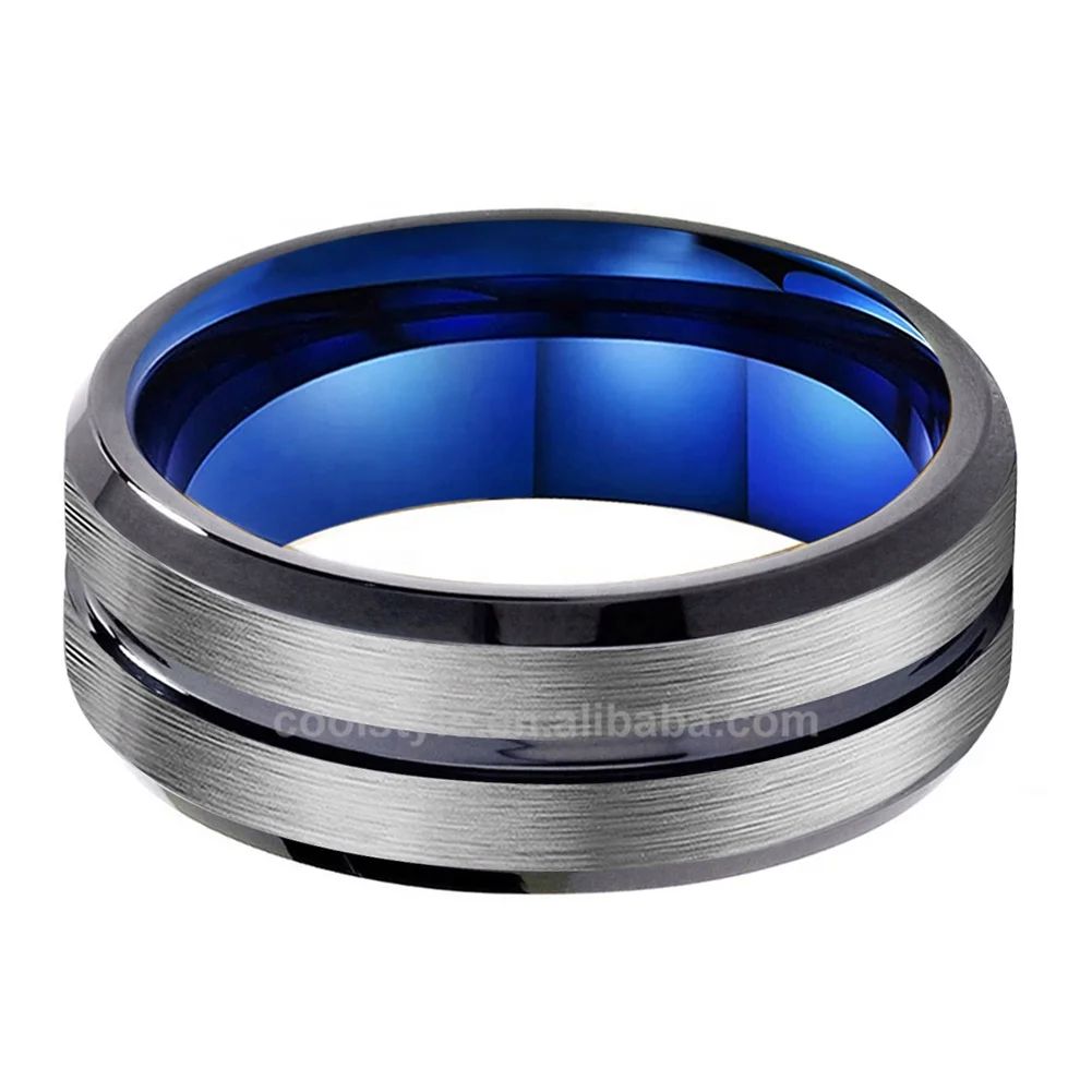 Coolstyle Jewelry 8mm Black Blue Tungsten Carbide Ring for Men Women Engagement Band Beveled Edges Grooved Brushed Comfort Fit