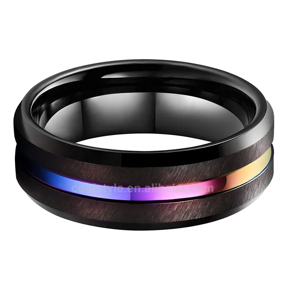 Coolstyle Jewelry 8mm Black Rainbow Tungsten Ring for Men Women Engagement Band Beveled Edge Grooved Matte Comfort Fit
