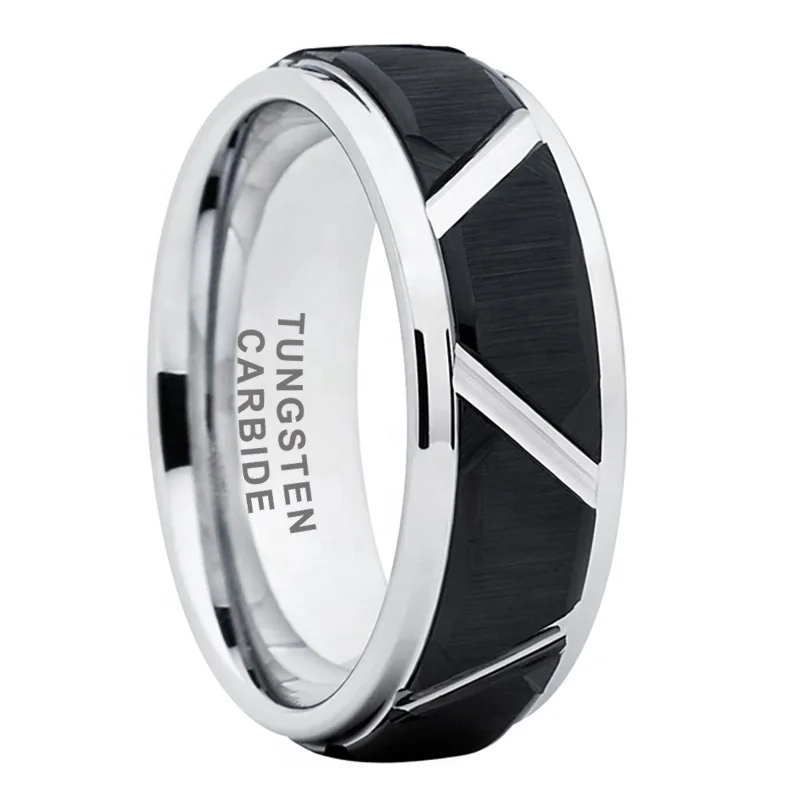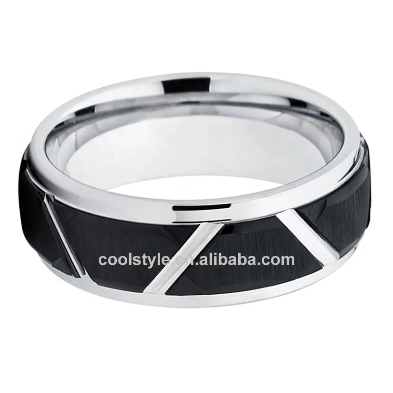 Coolstyle Jewelry 8mm Black Silver Tungsten Ring for Men Women Engagement Band Brushed Finish Grooved Stepped Edges Comfort Fit