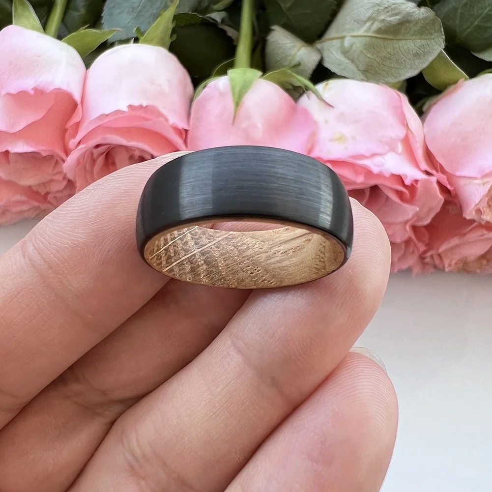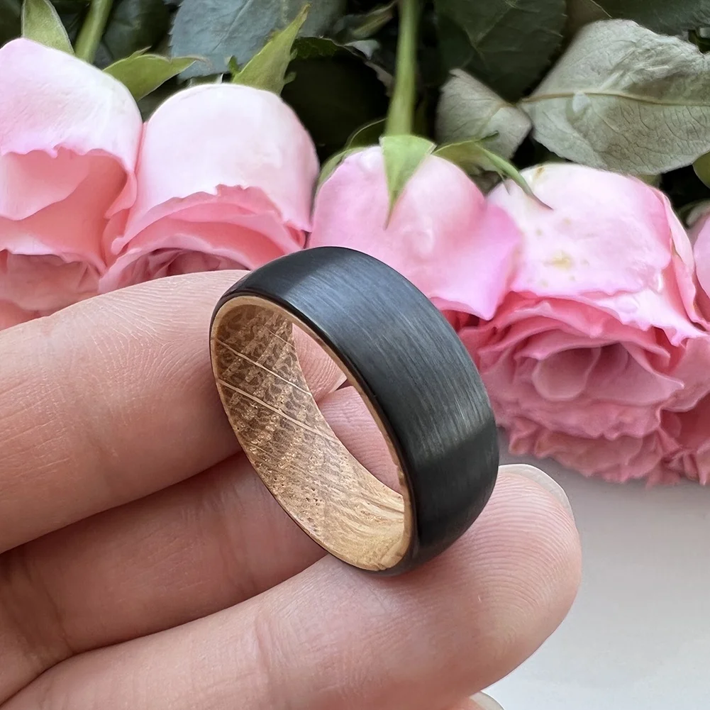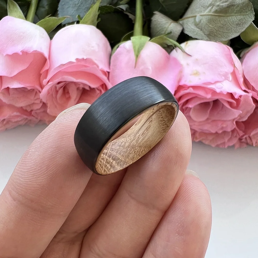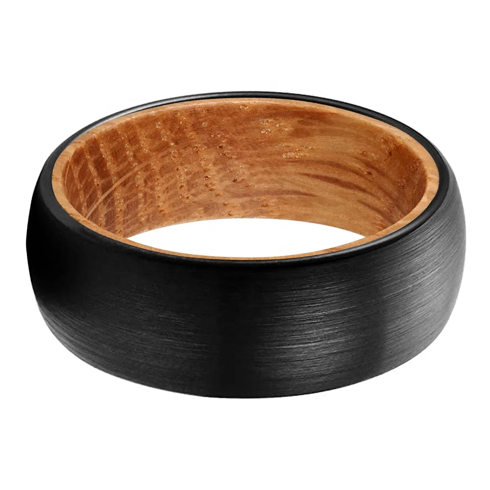 Coolstyle Jewelry Wholesale 8mm Whisky Barrel Oak Wood Inlay Black Tungsten Carbide Ring for Men Women Fashion Engagement Band