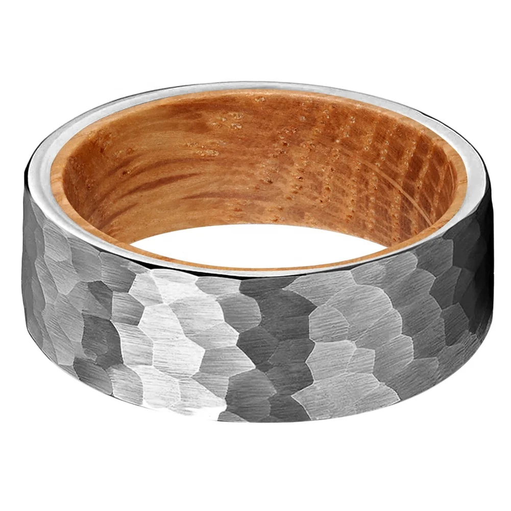 Coolstyle Jewelry 8mm Wholesale Natural Whisky Wood Inlay Hammered Tungsten Ring for Men Women Fashion Engagement Wedding Band