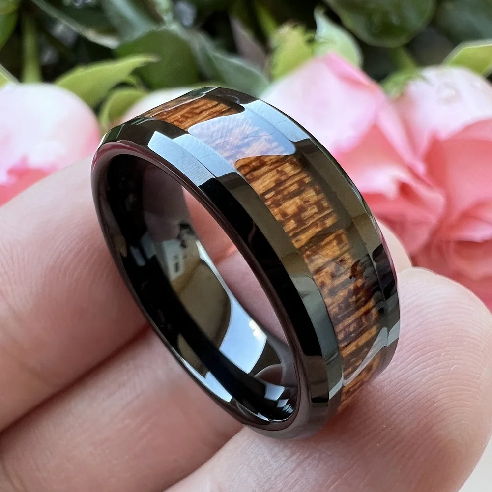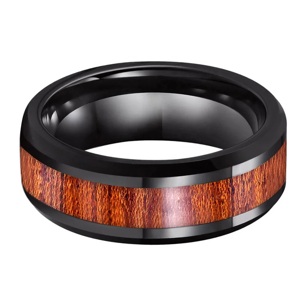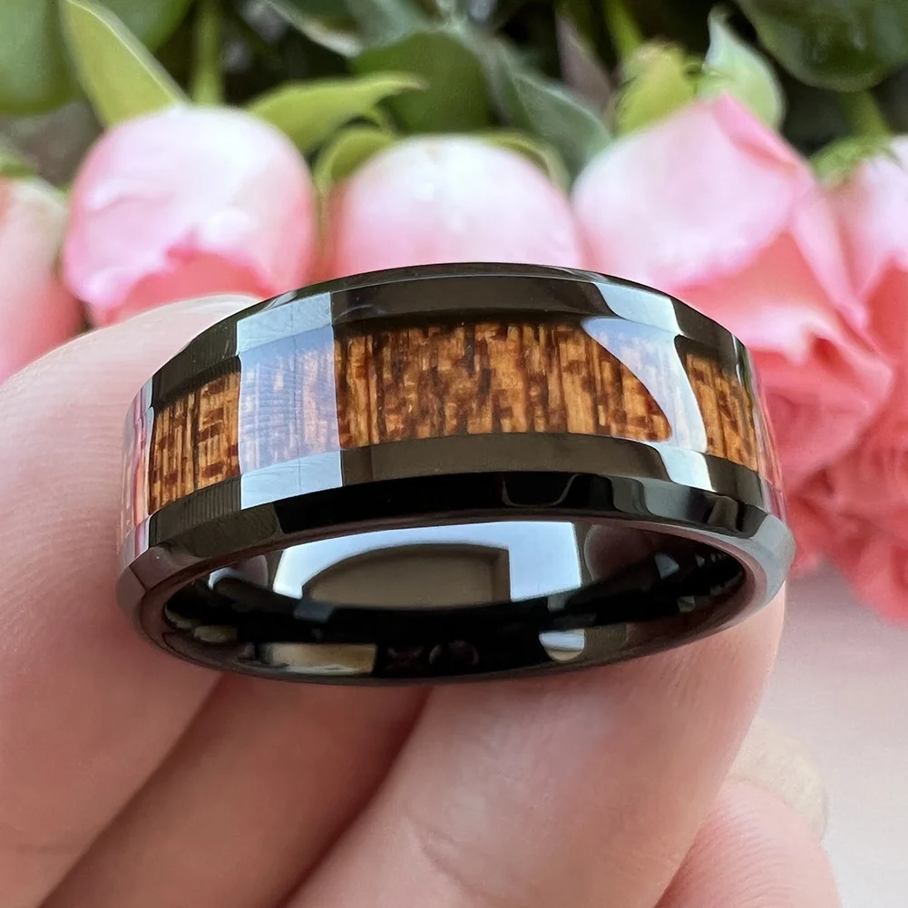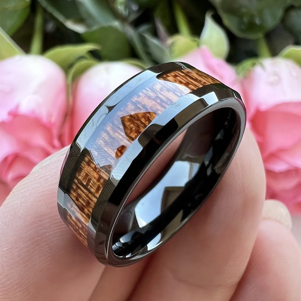 Coolstyle Jewelry 8mm Koa Wood Inlay Black Tungsten Ring for Men Women Trendy Engagement Wedding Band Beveled Comfort Fit