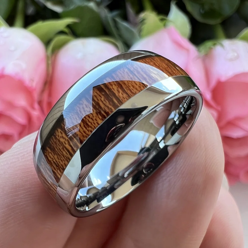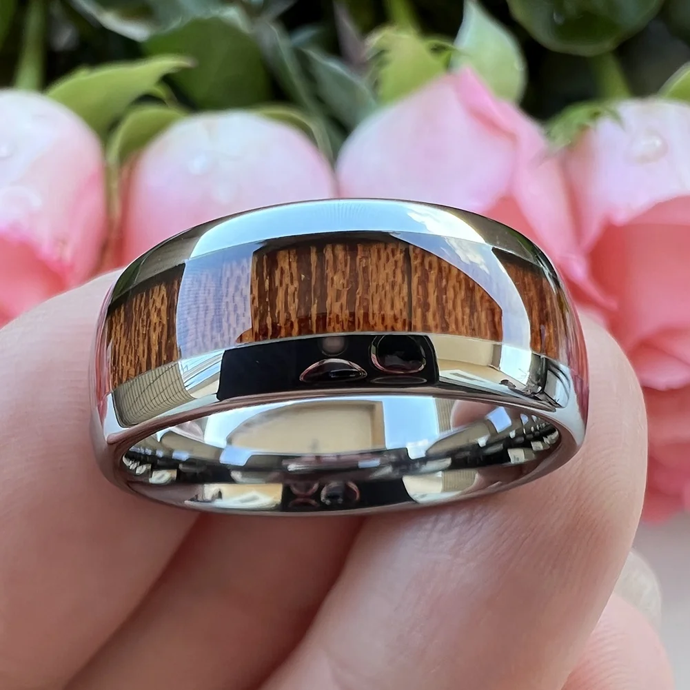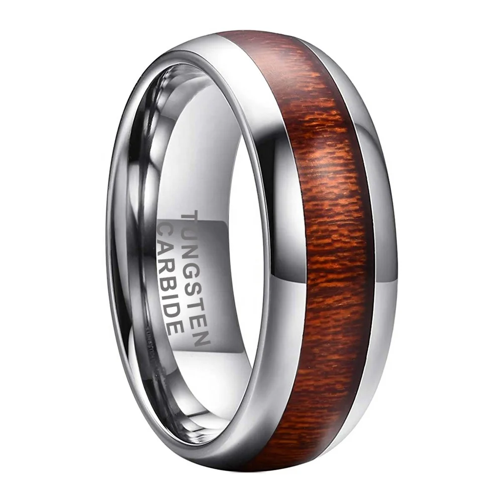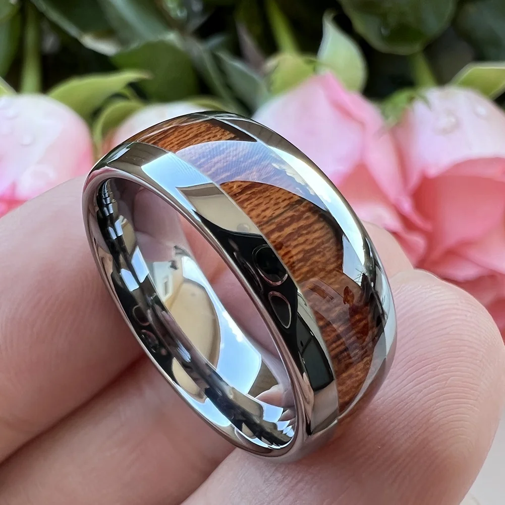 Coolstyle Jewelry 8mm Koa Wood Inlay Tungsten Carbide Ring for Men Women Fashion Engagement Wedding Band Domed Comfort Fit