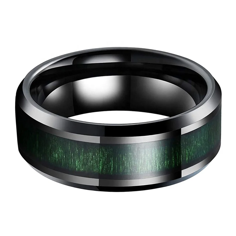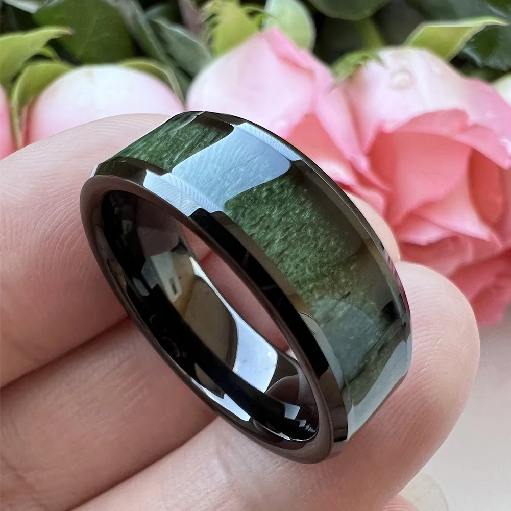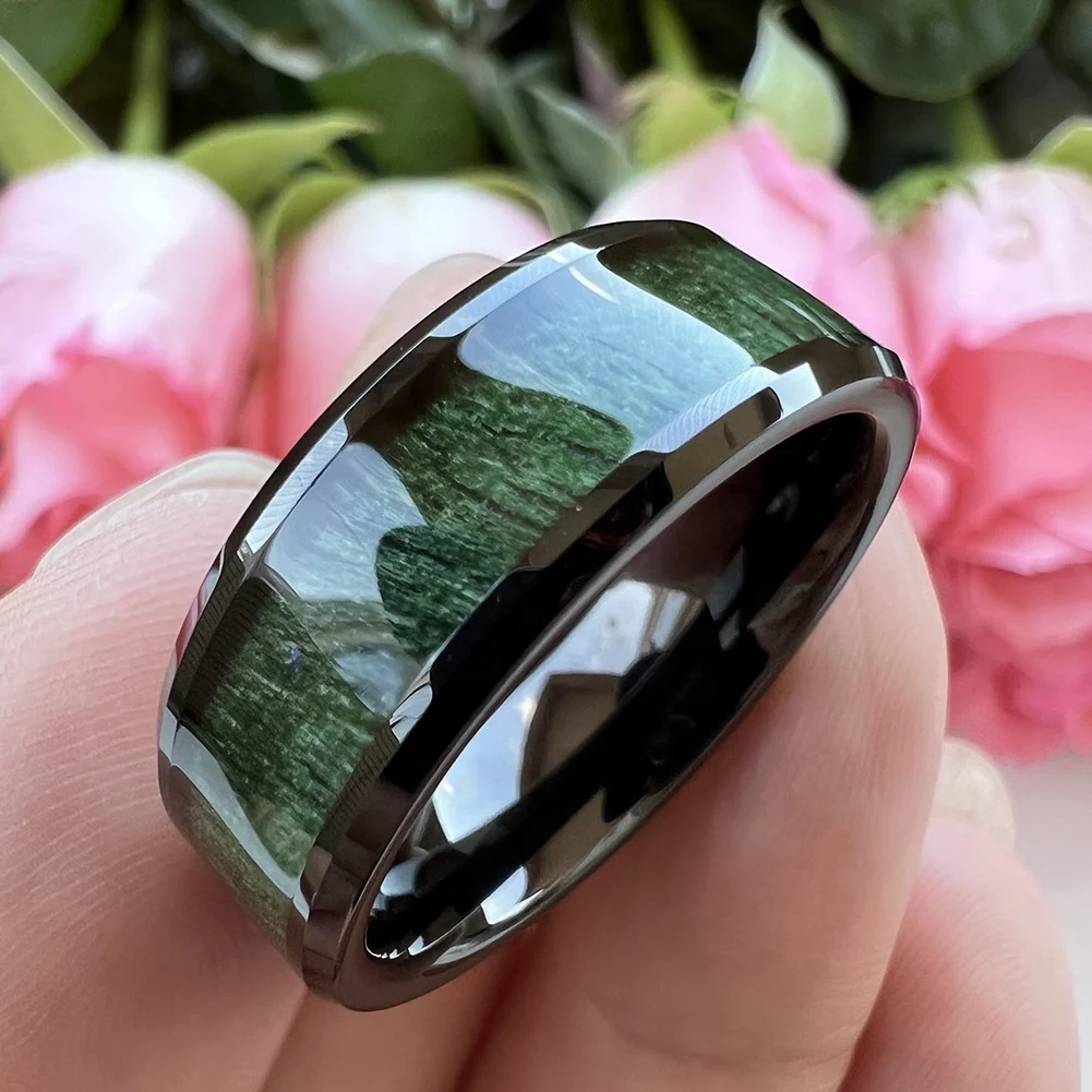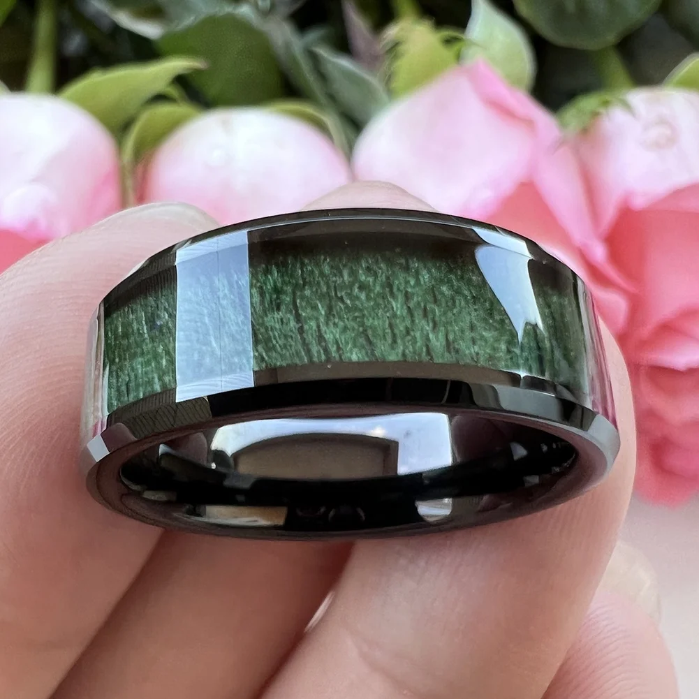 Coolstyle Jewelry 8mm Beveled Polished Black Tungsten Ring for Men Women Green Wood Inlay Fashion Engagement Wedding Band
