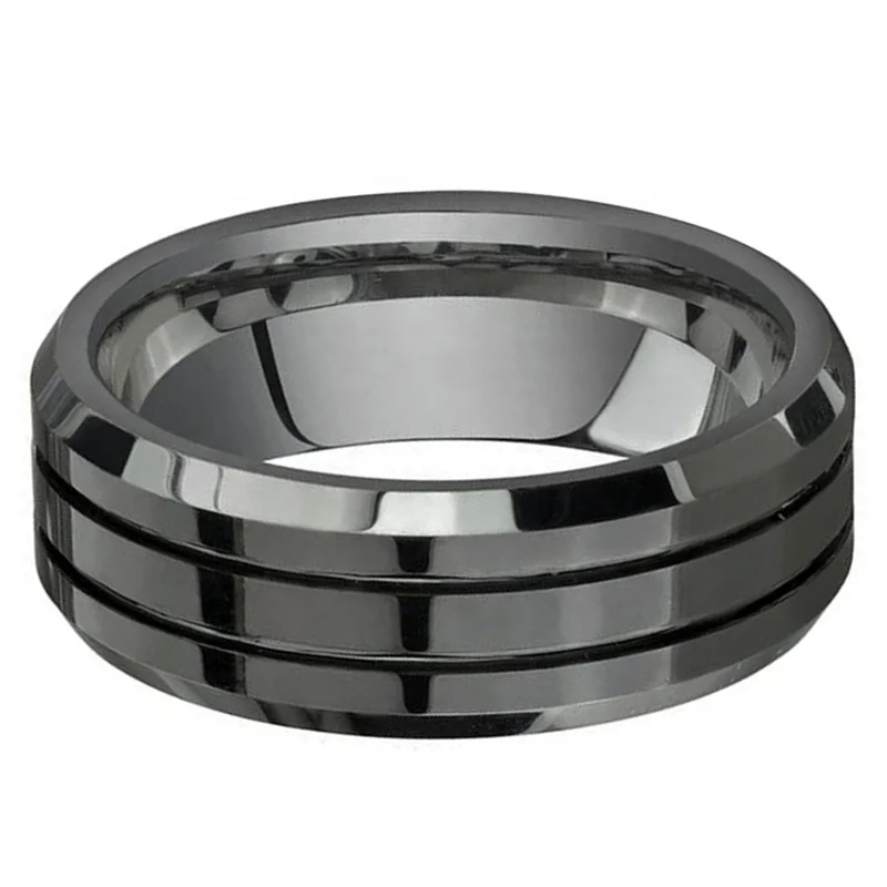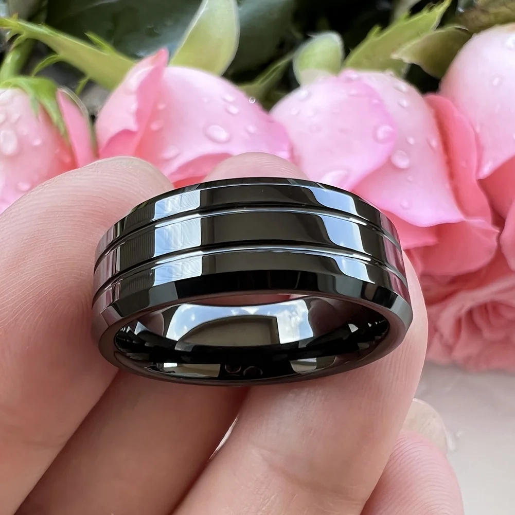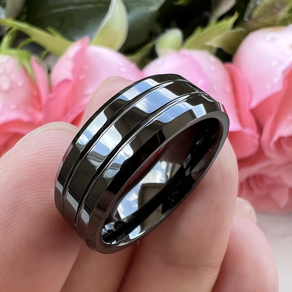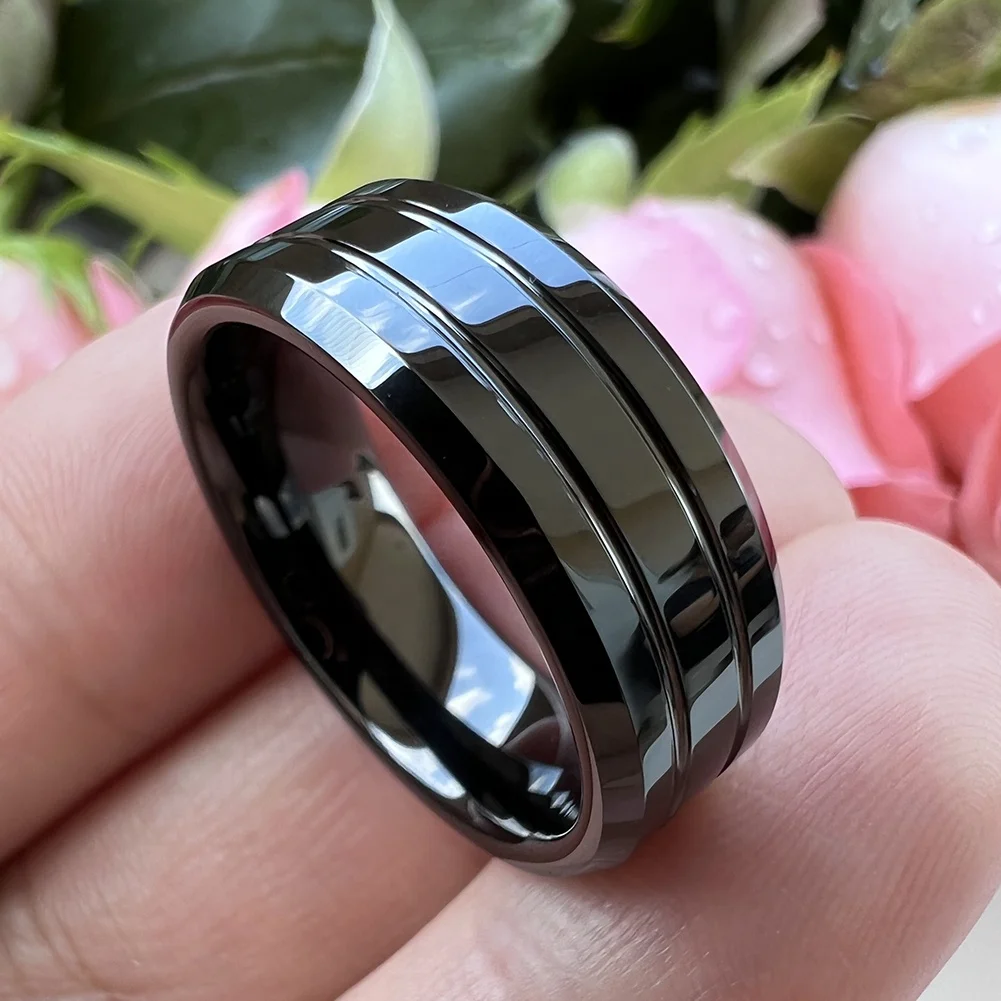 Coolstyle Jewelry 8mm Wholesale Two Line Beveled Edges Black Tungsten Finger Ring for Men Women Fashion Engagement Wedding Band