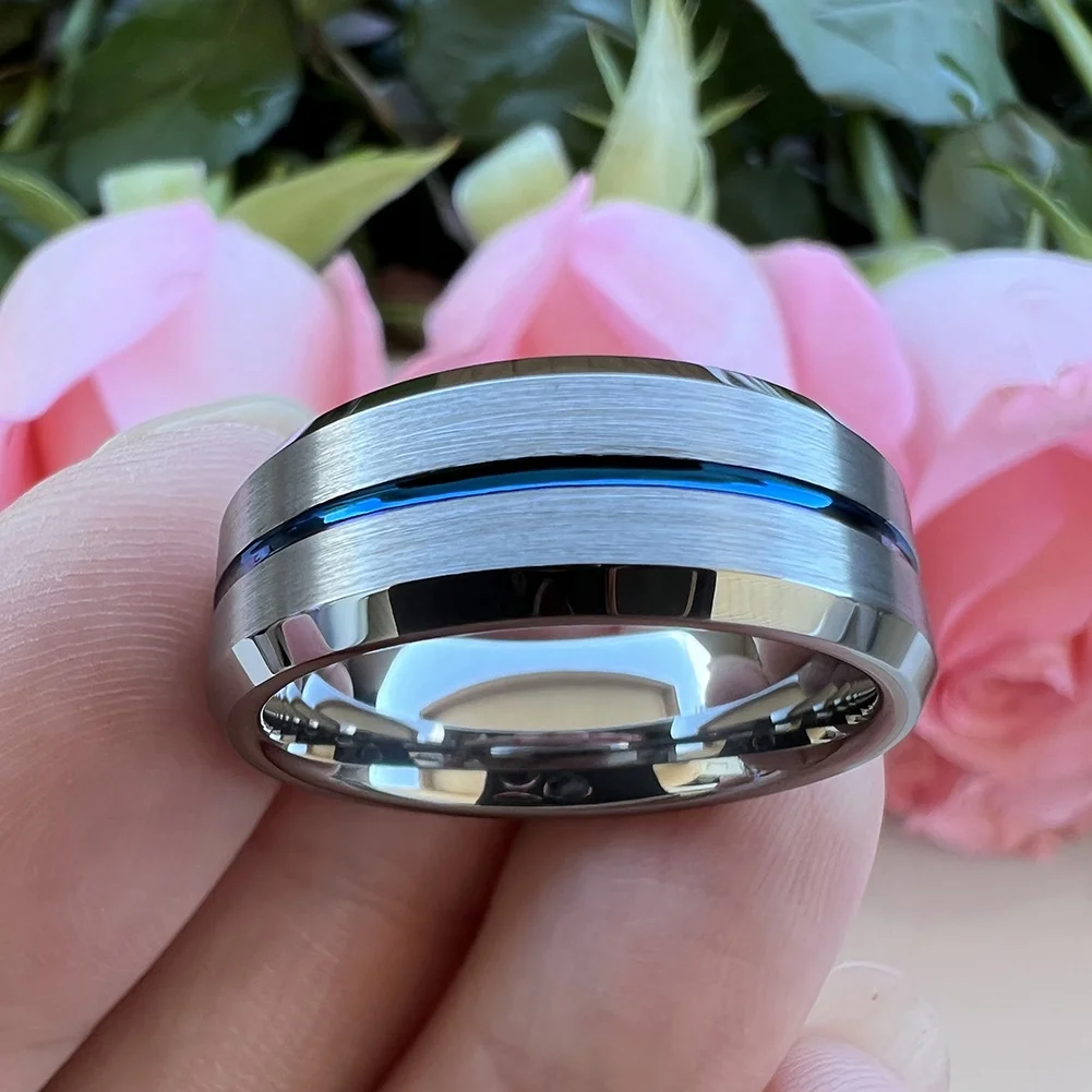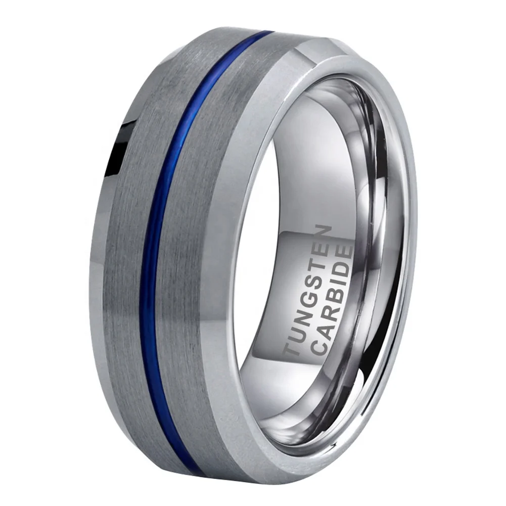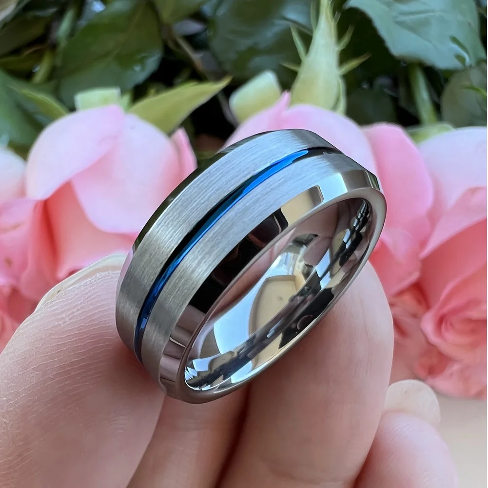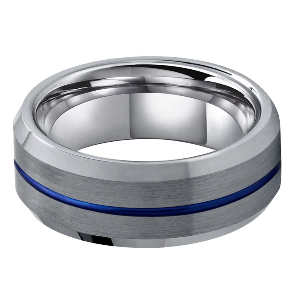 Coolstyle Jewelry 8mm Wholesale Center Line Beveled Blue Tungsten Wedding Band for Men Women Fashion Engagement Finger Rings