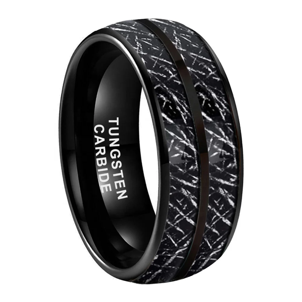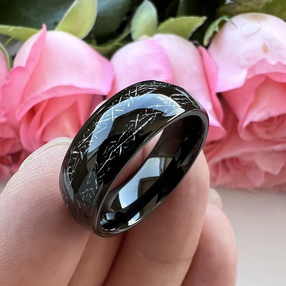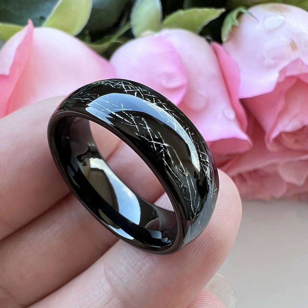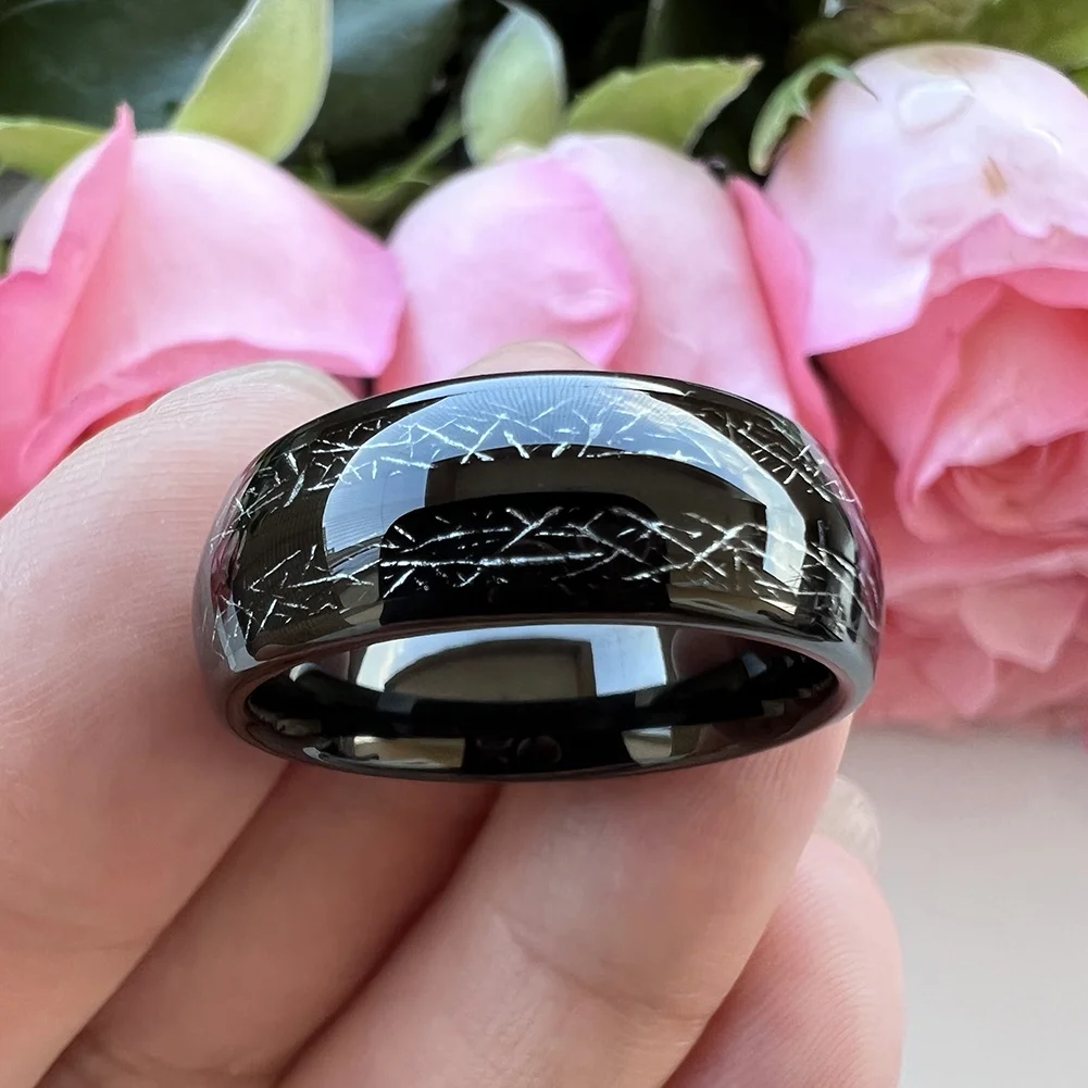 Coolstyle Jewelry 8mm Domed Double Meteorite Inlay Black Tungsten Ring for Men Women Fashion Engagement Wedding Band