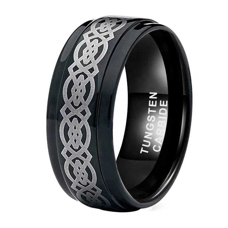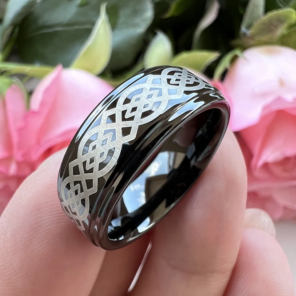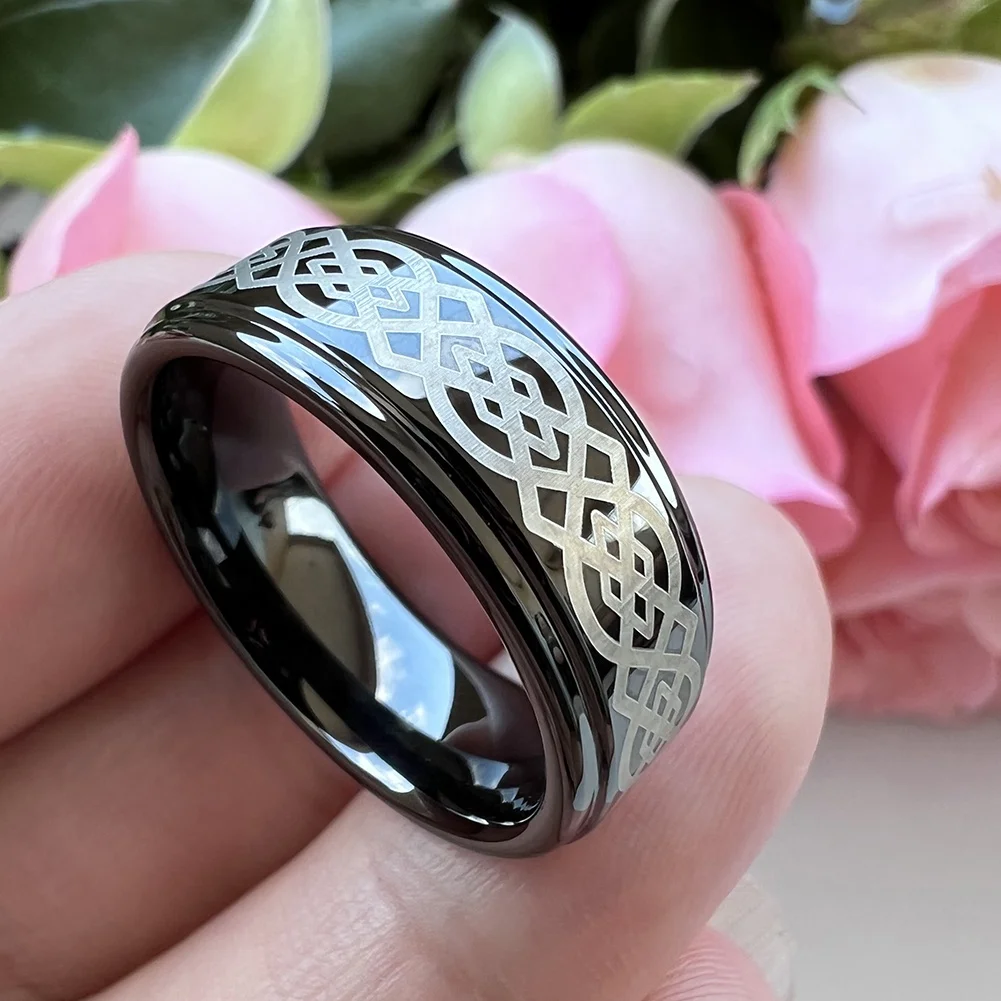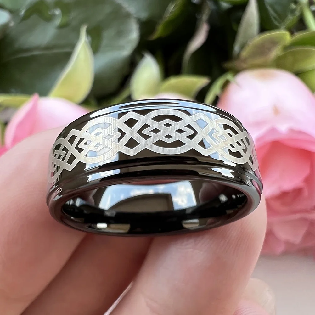 Coolstyle Jewelry 8mm Black Tungsten Rings Engagement Wedding Bands Celtic Knot Engraved Stepped Edges Polished Comfort Fit