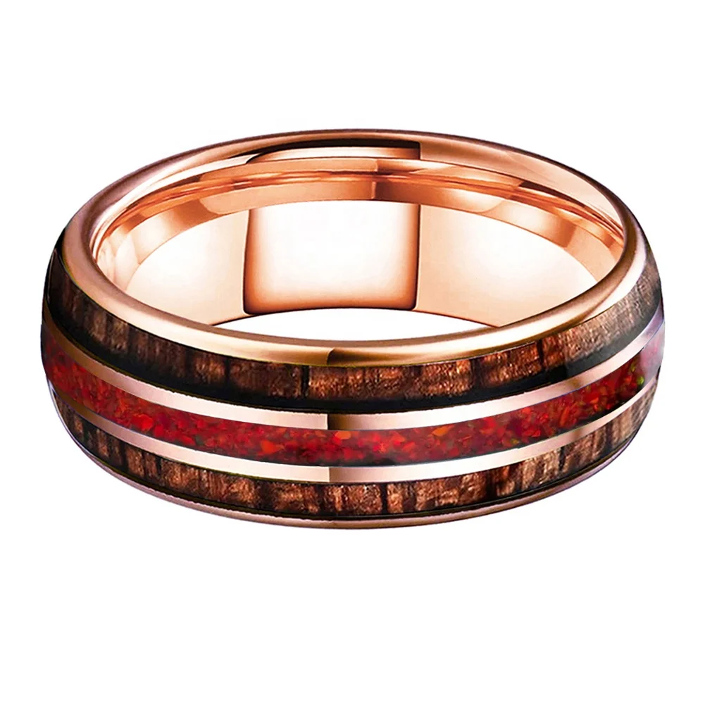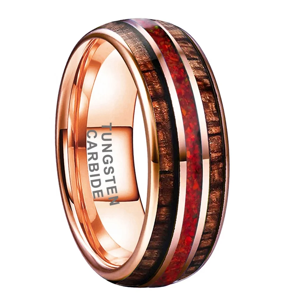 Coolstyle Jewelry Rose Gold 8mm Men Women Engagement Ring Wedding Band Red Red Opal Wood Inlay Tungsten Carbide Fashion Jewelry