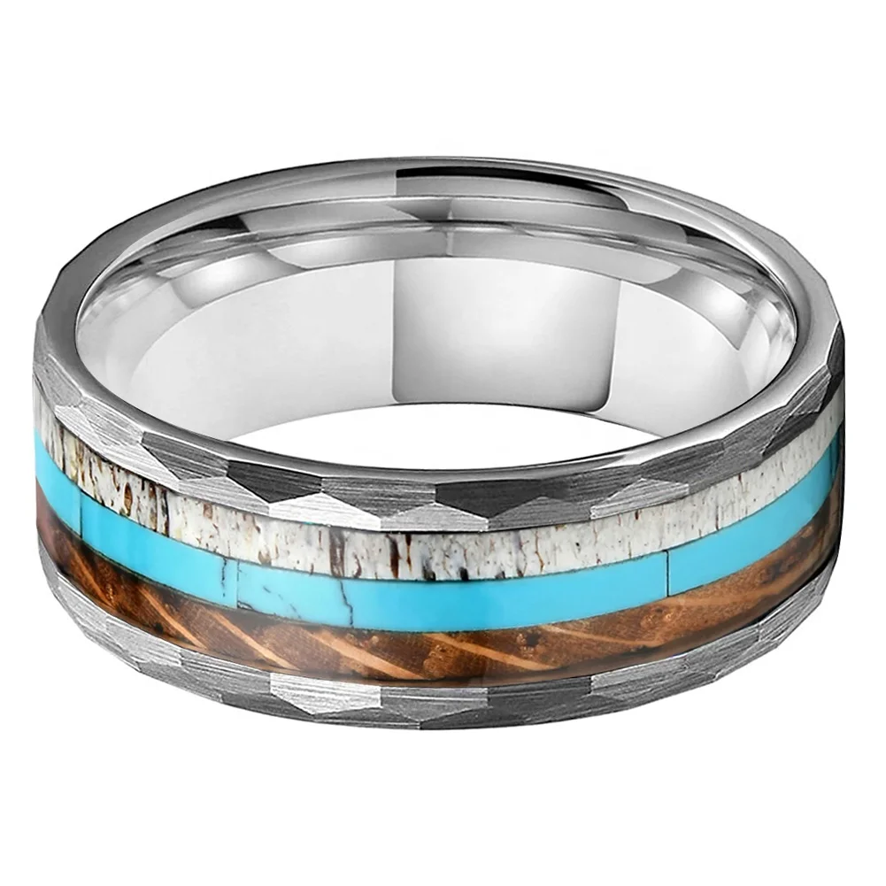 Coolstyle Jewelry New Design 8mm Men Women Trendy Engagement Wedding Band Whisky Wood Deer Antler Turquoise Inlay Tungsten Ring