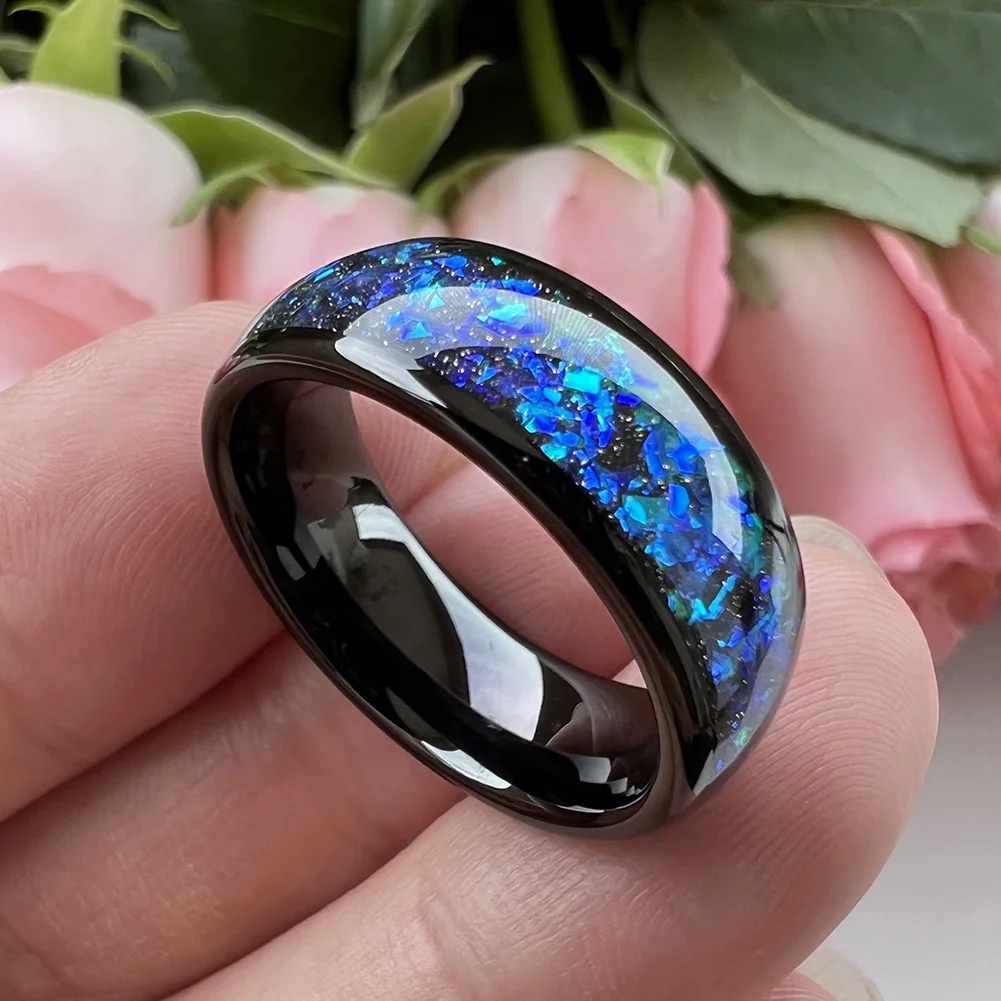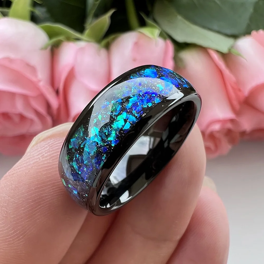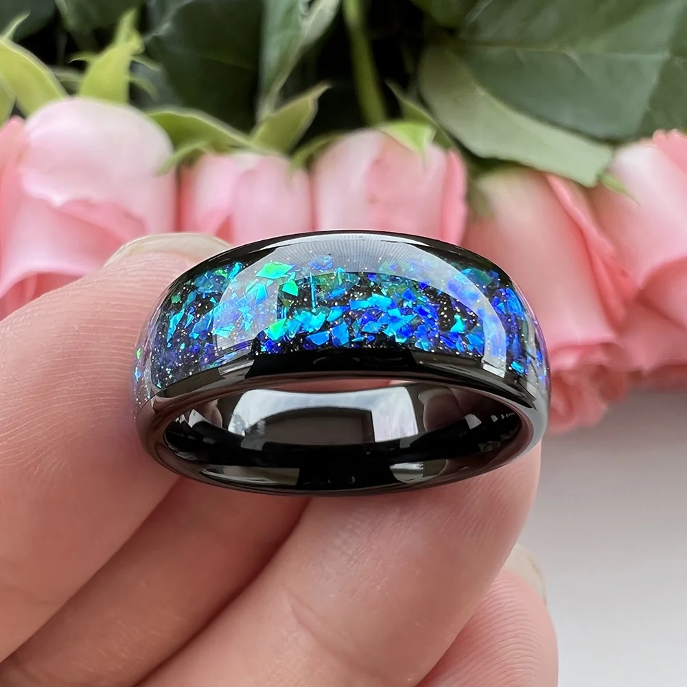 Coolstyle Jewelry 8mm Black Tungsten Carbide Wedding Ring Shining Blue-Green Fragments Engagement Band Domed Polished Shiny