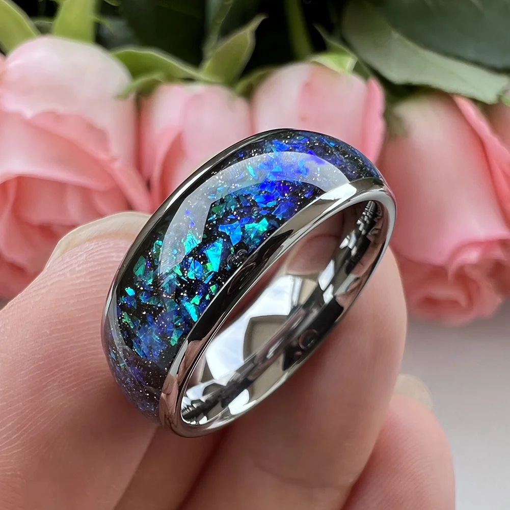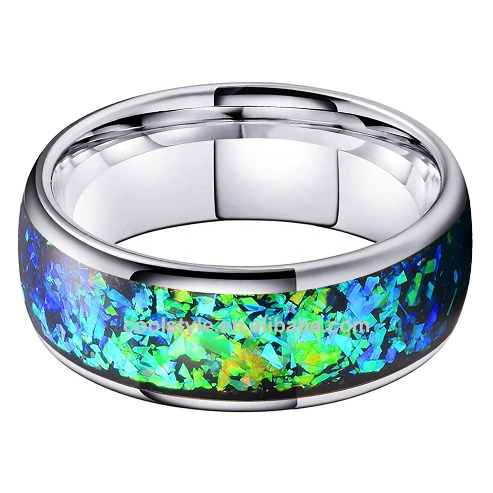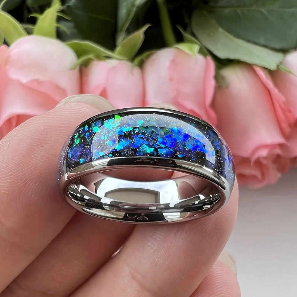 Coolstyle Jewelry 8mm Tungsten Carbide Wedding Ring Shining Blue Green Fragments Engagement Band Domed Polished Shiny