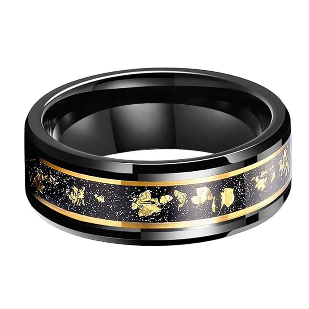 Coolstyle Jewelry Wholesale Black Tungsten Ring for Men Women Gold Foil Inlay Wedding Band Beveled Edges Polished Shiny