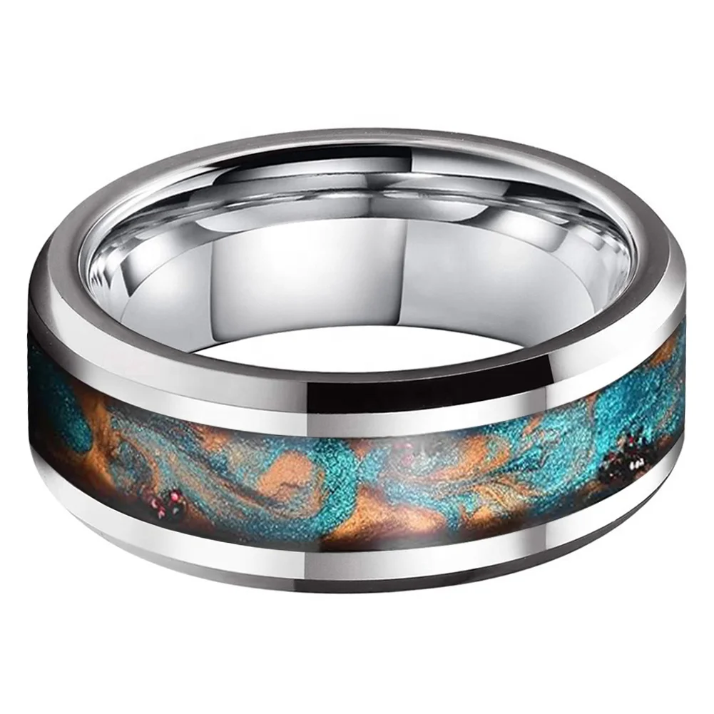 8mm Wholesale Mens Womens Fashion Wedding Bands Beveled Blue Brown Gold Flowing Sand Inlay Black Tungsten Carbide Ring