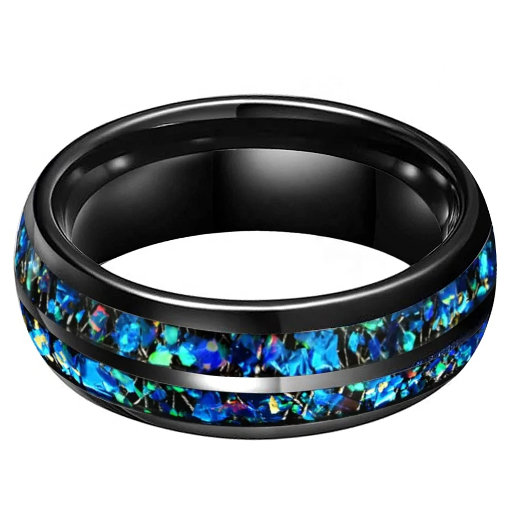 Coolstyle Jewelry 8mm Domed Engagement Promise Wedding Band for Men Women Blue Green Opal Chip Inlay Black Tungsten Ring