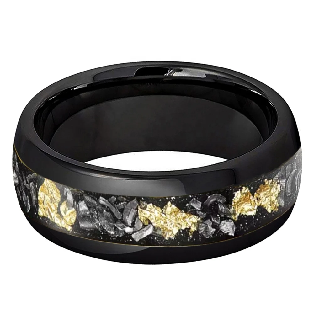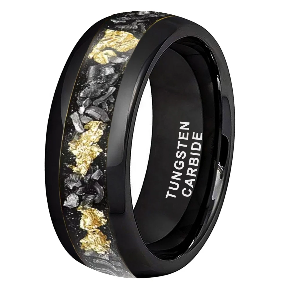 Coolstyle Jewelry 8mm Engagement Wedding Band for Men Women Imitated Meteorite Chip Gold Foil Inlay Black Tungsten Carbide Ring