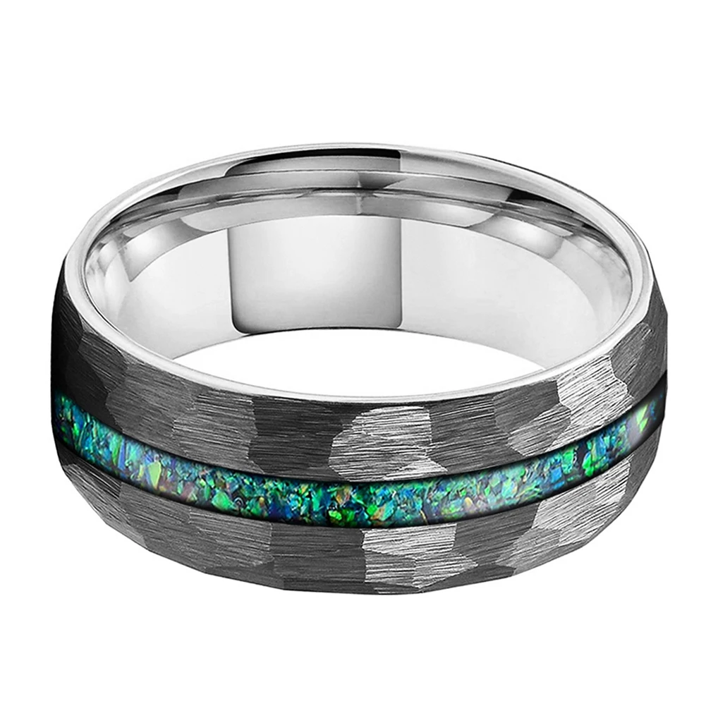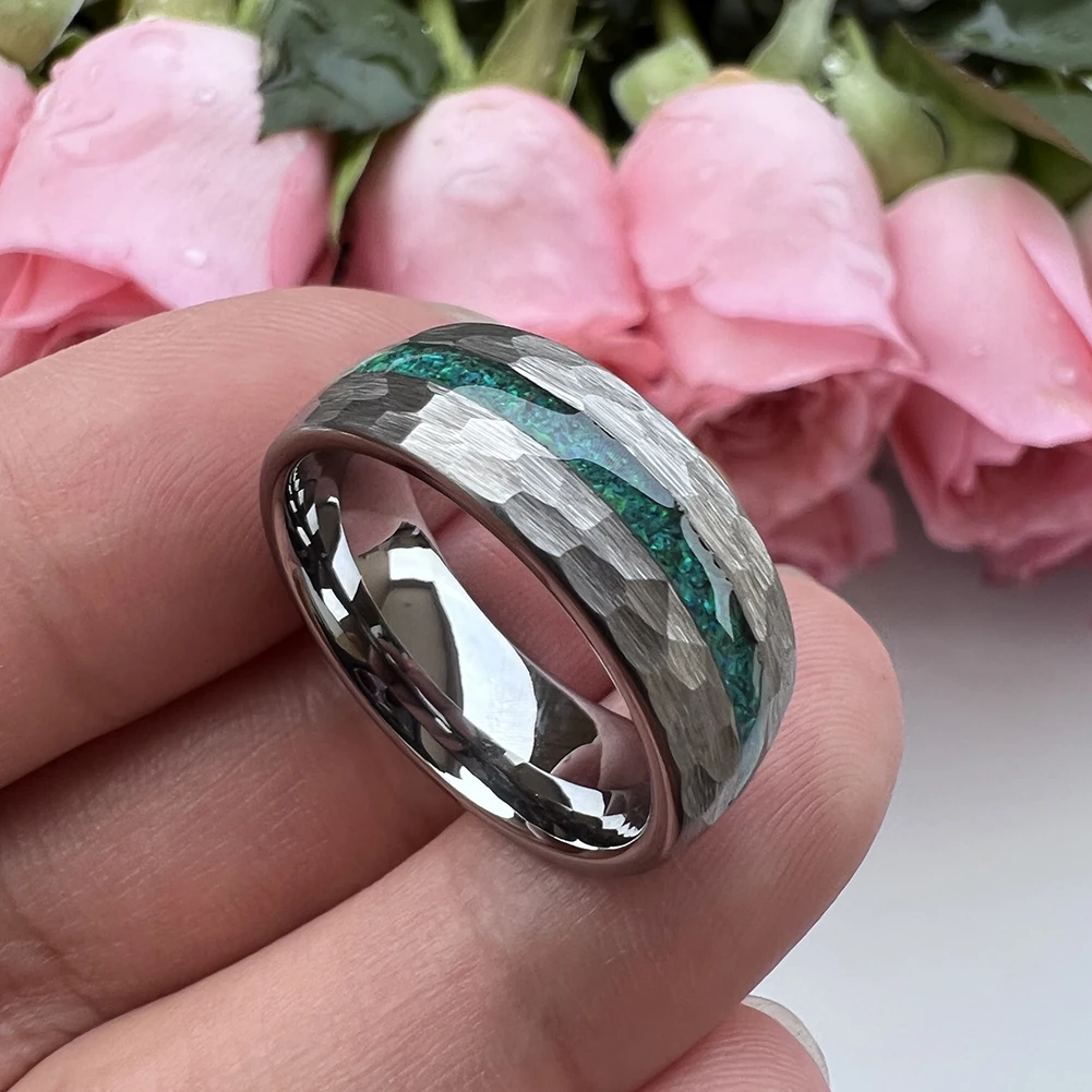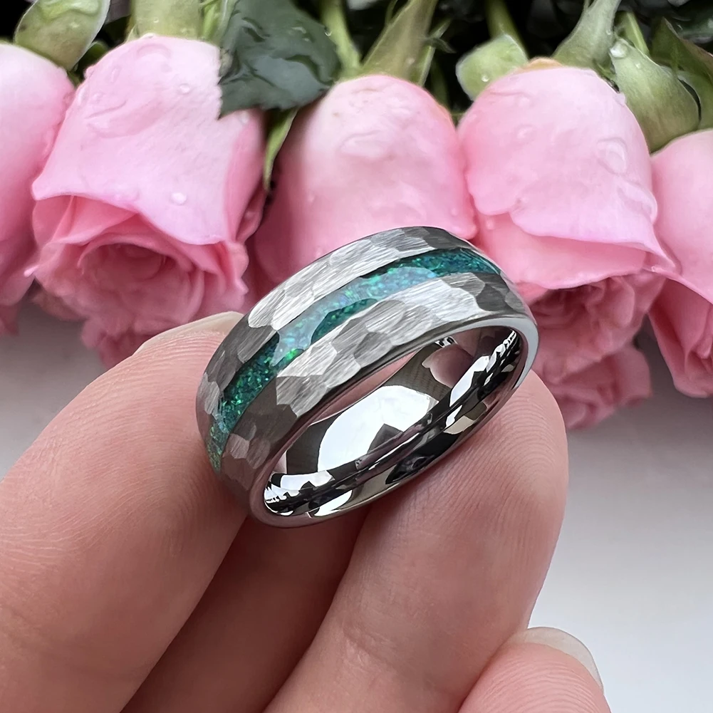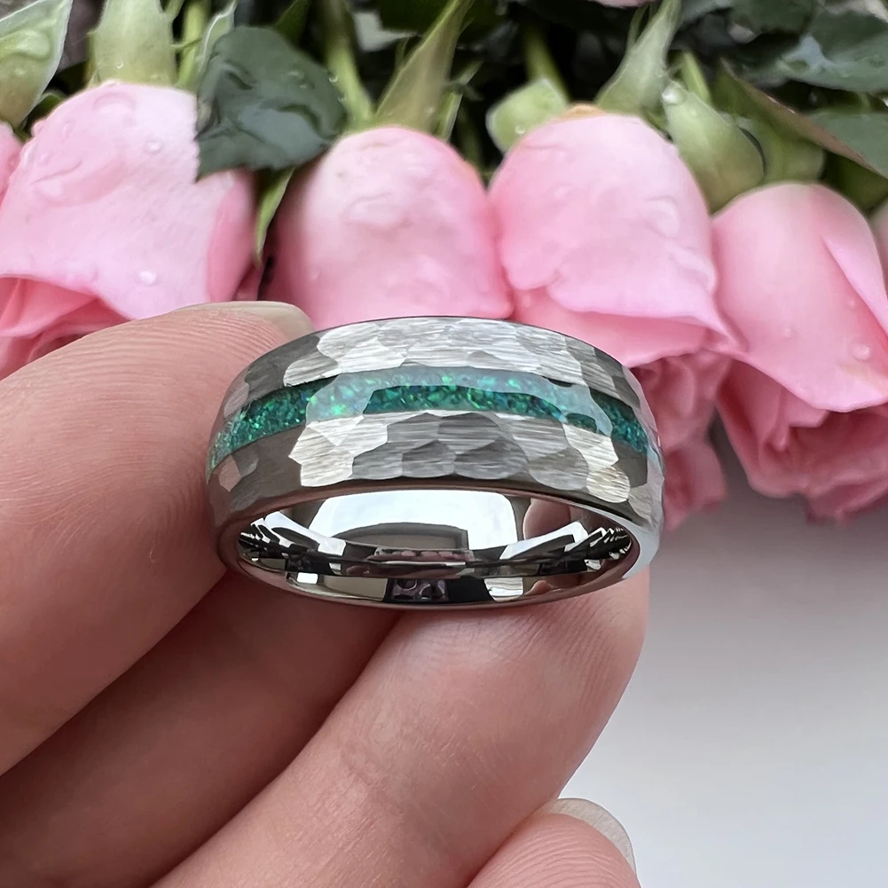 Coolstyle Jewelry 8mm Fashion Wholesale Men Women Engagement Wedding Crushed Green Opal Inlay Hammered Tungsten Carbide Ring