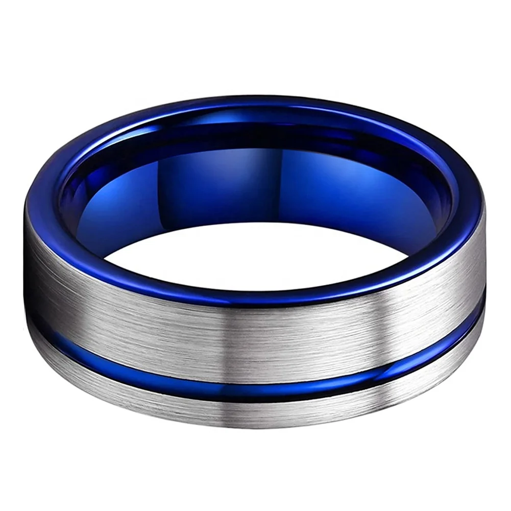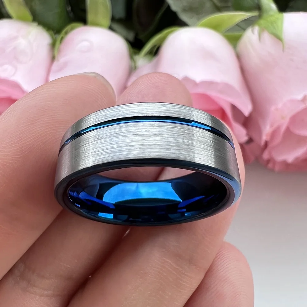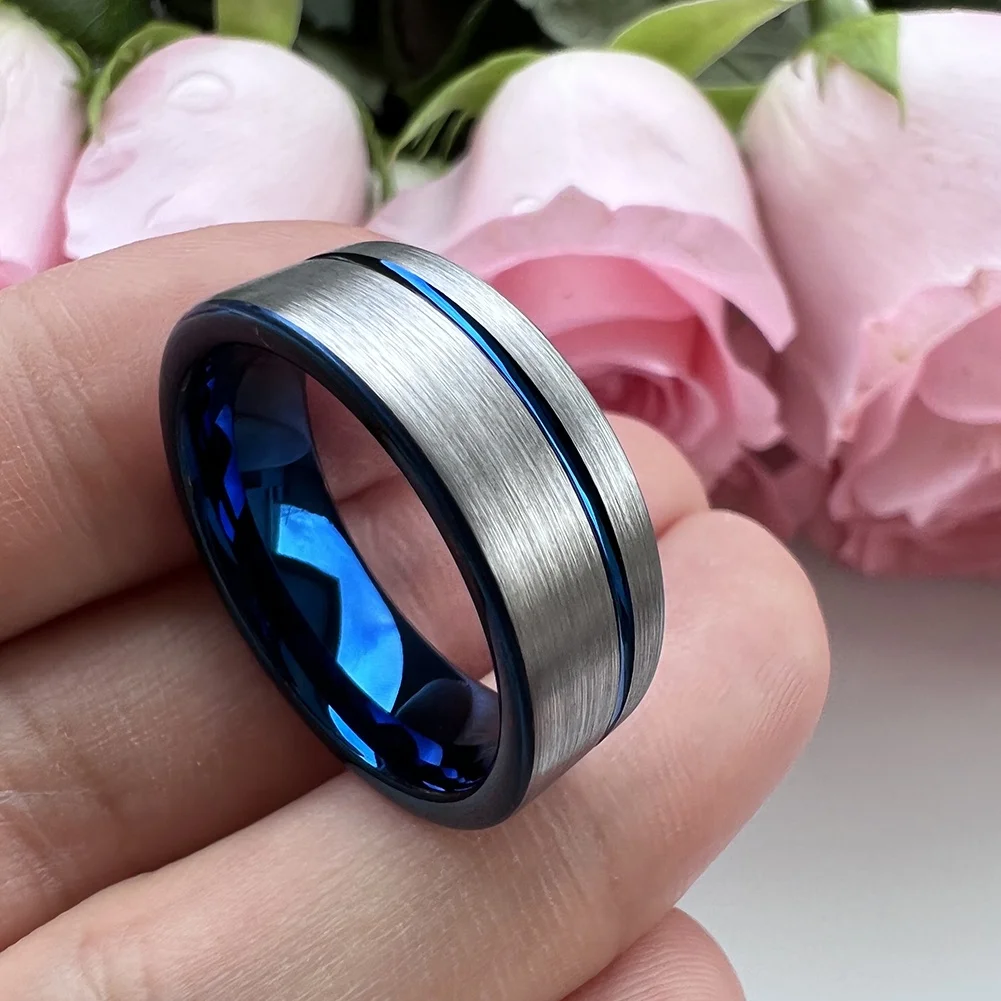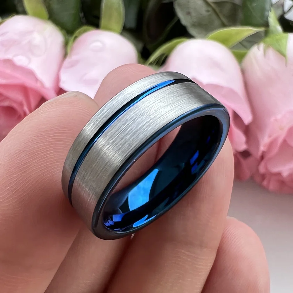 Coolstyle Jewelry 8mm Pipe Cut Offset Line Blue Tungsten Carbide Ring for Men Women Fashion Engagement Wedding Band
