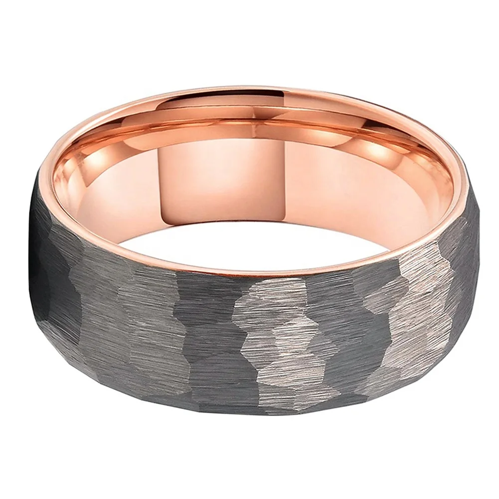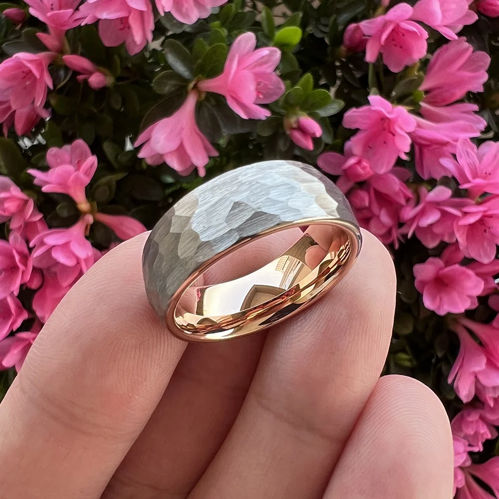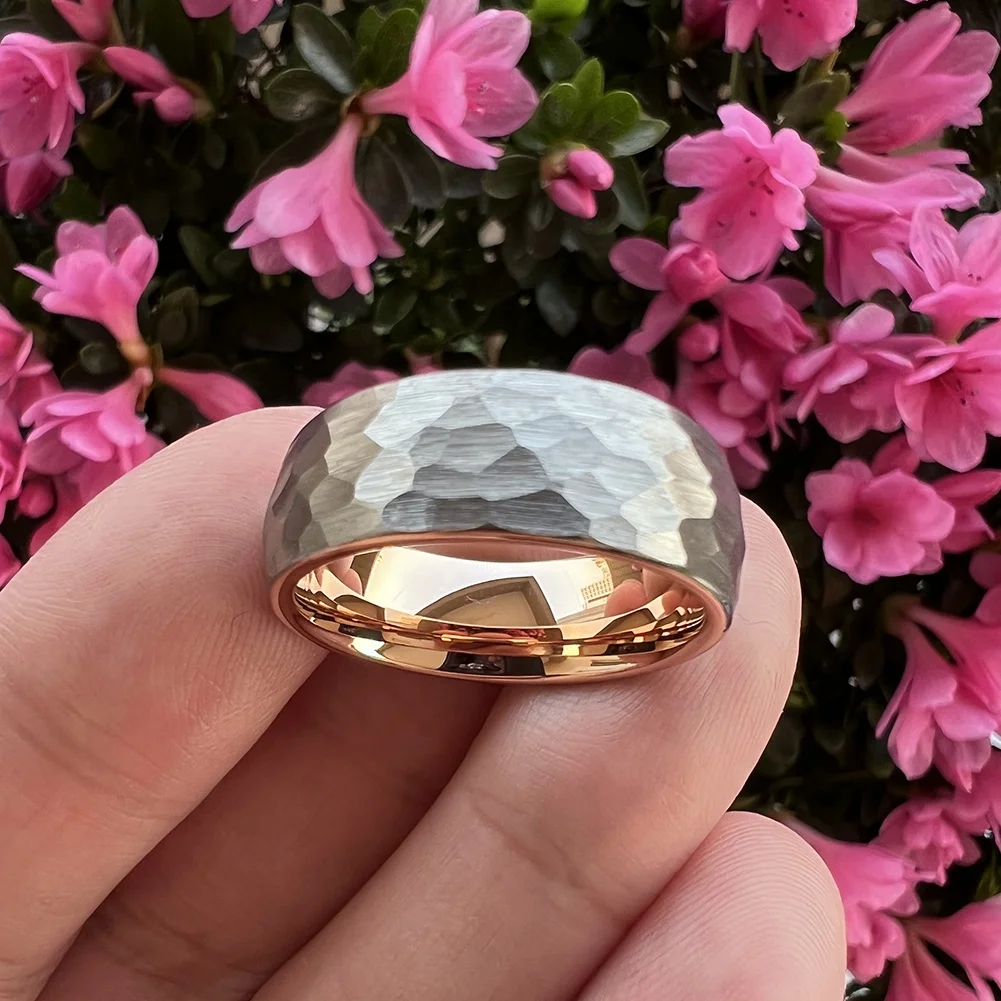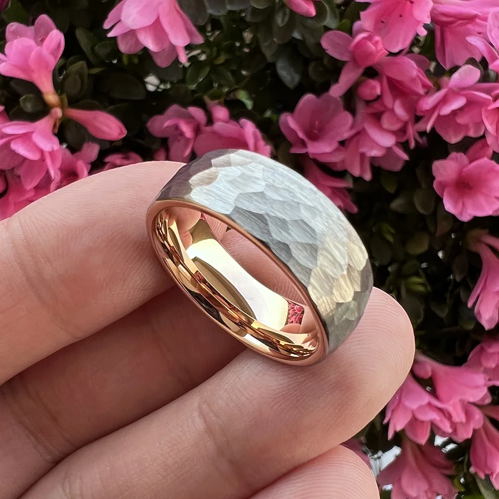 Coolstyle Jewelry Wholesale 8mm Two Tone Rose Gold Hammered Tungsten Carbide Ring for Men Women Fashion Engagement Wedding Band
