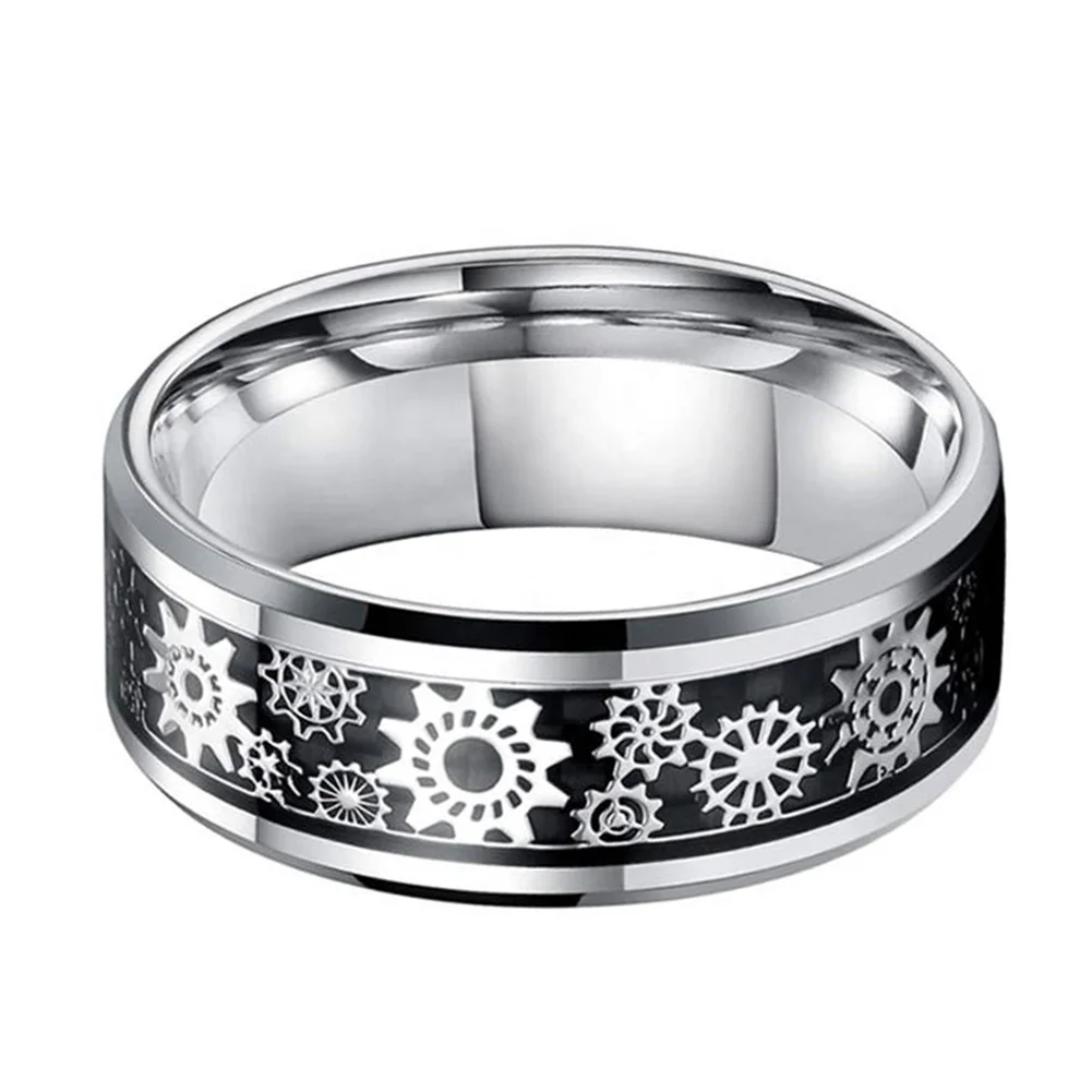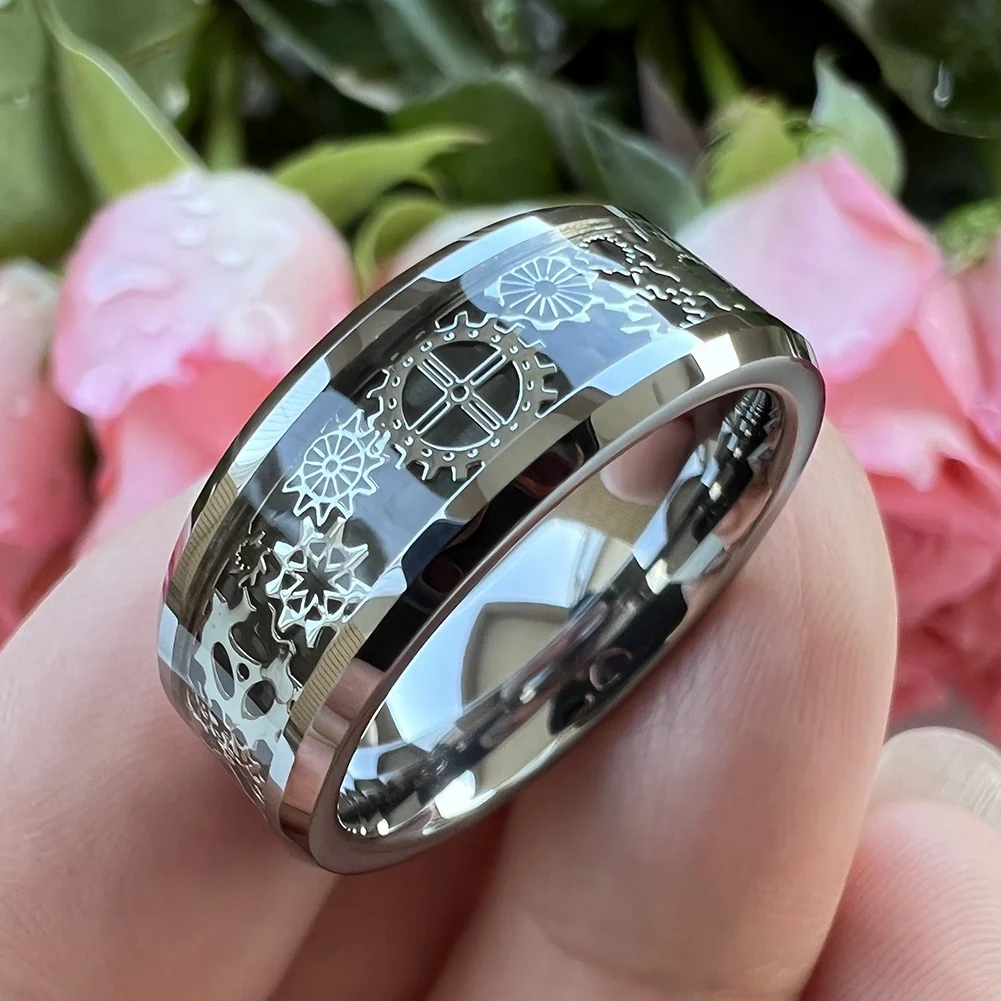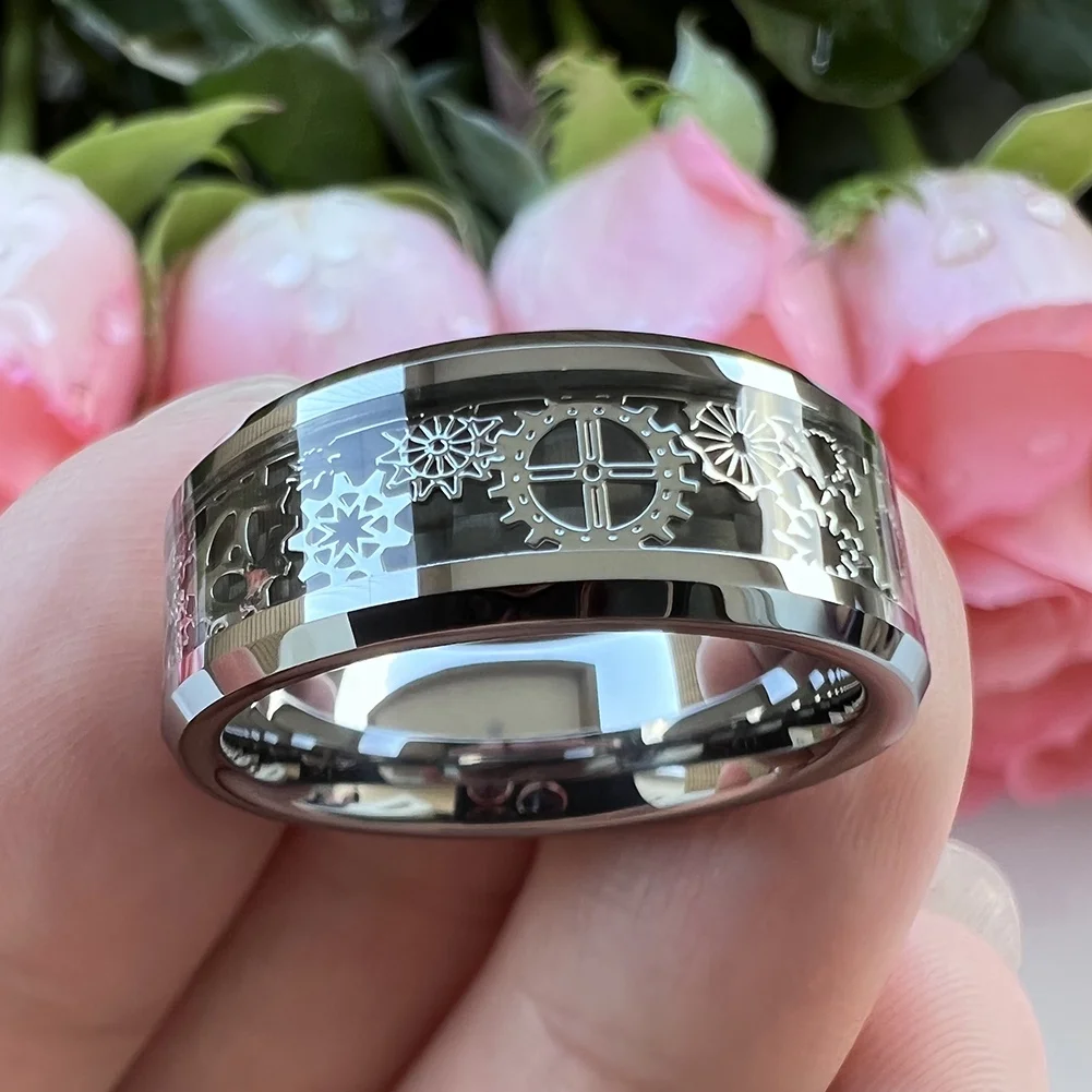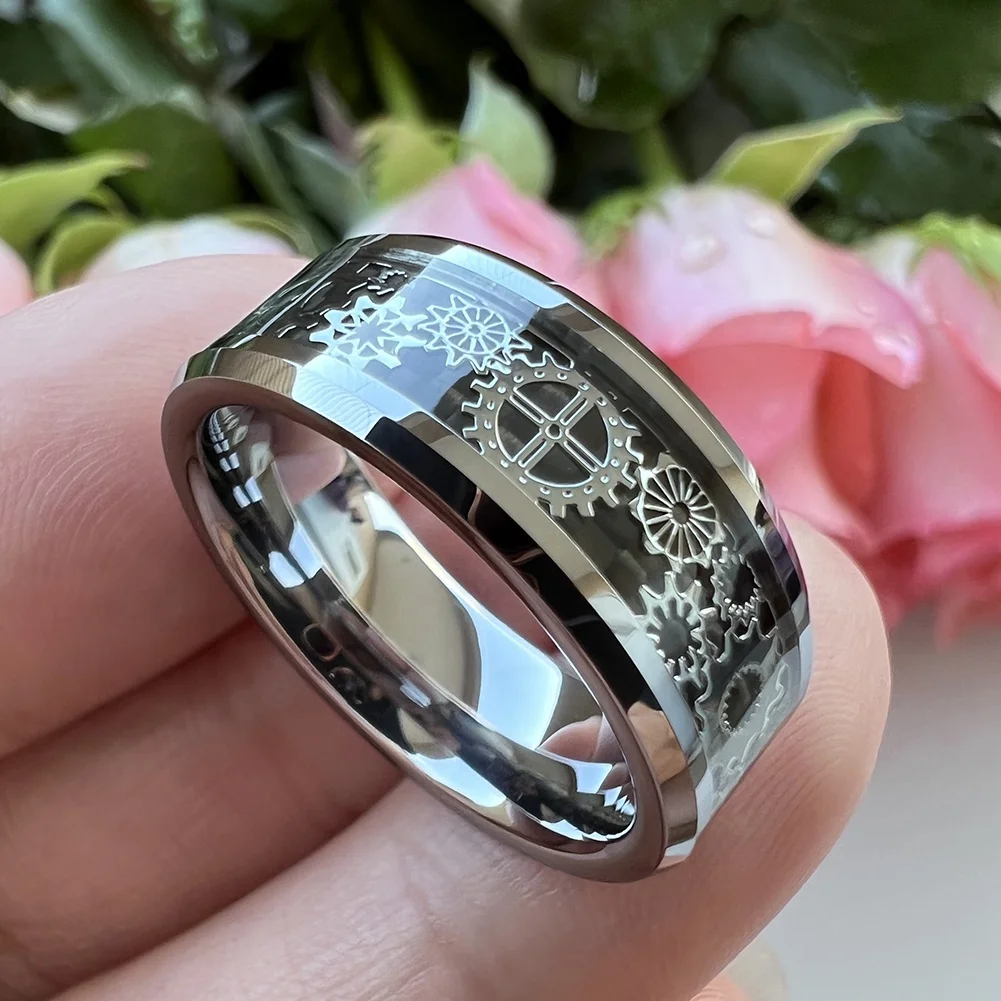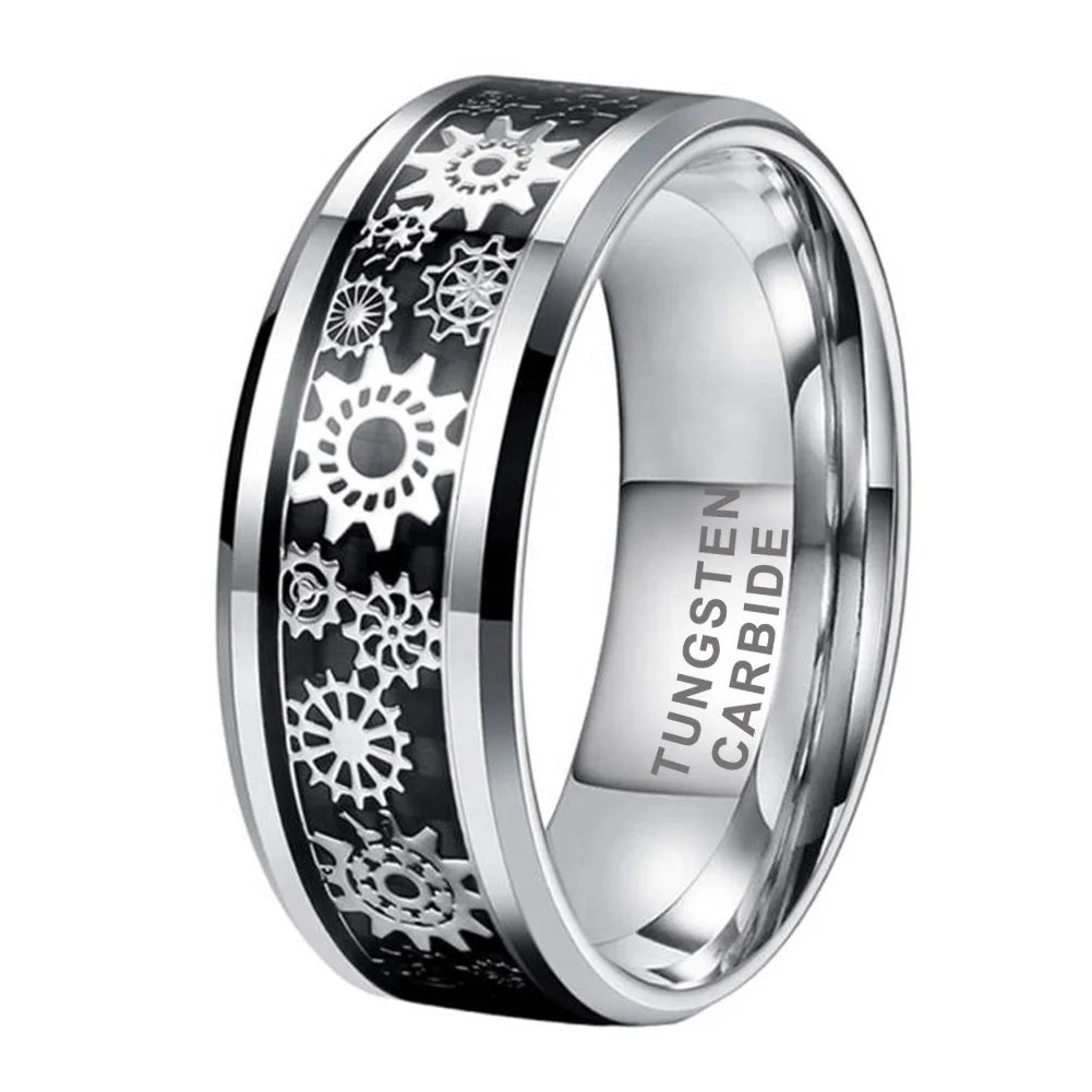 Coolstyle Jewelry 6mm 8mm Tungsten Ring Men Women Wedding Band Steampunk Gear Wheel Carbon Fiber Inlay Beveled Edges Comfort Fit