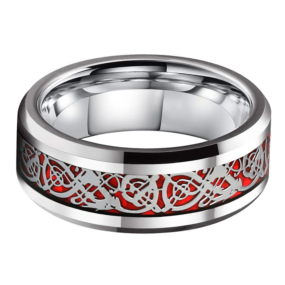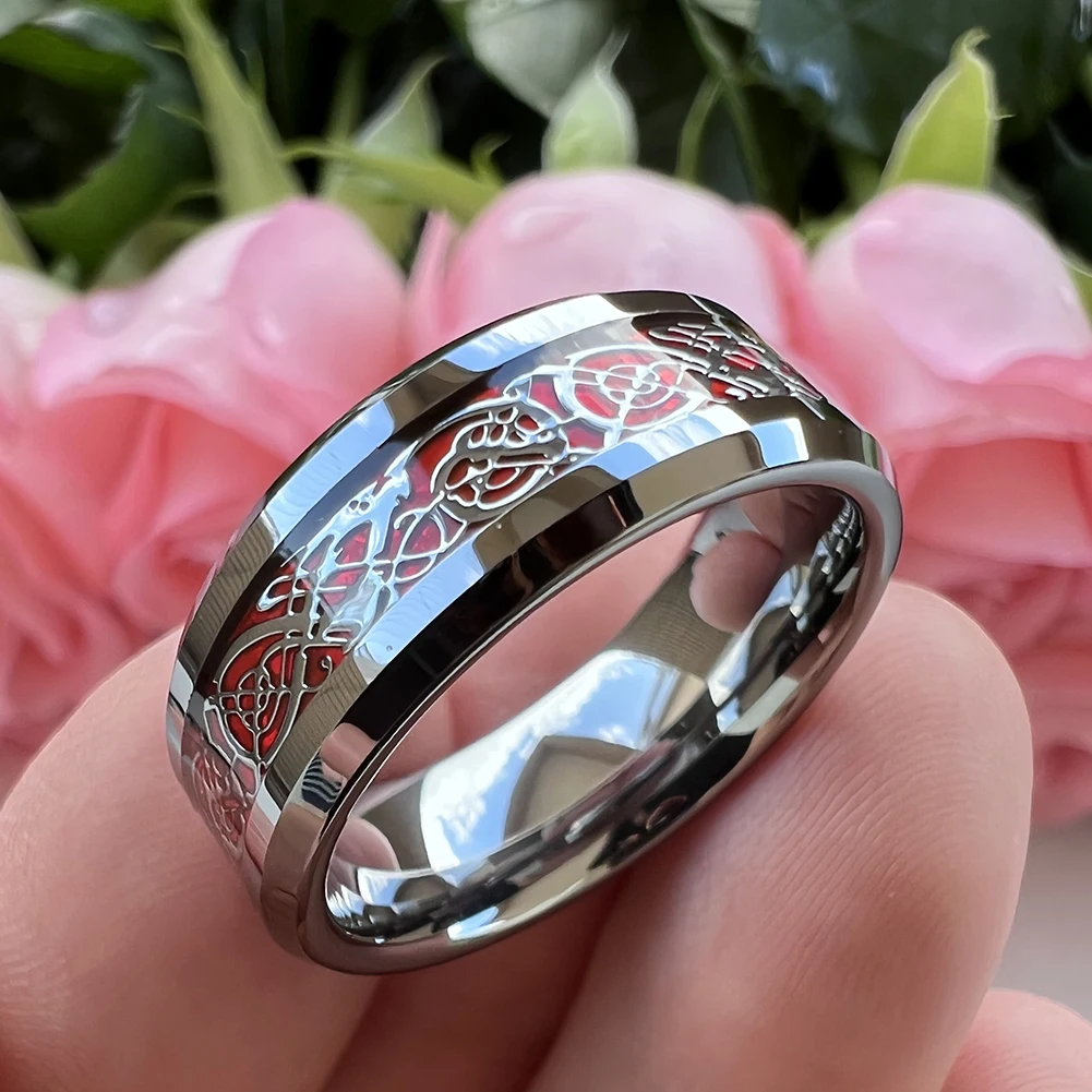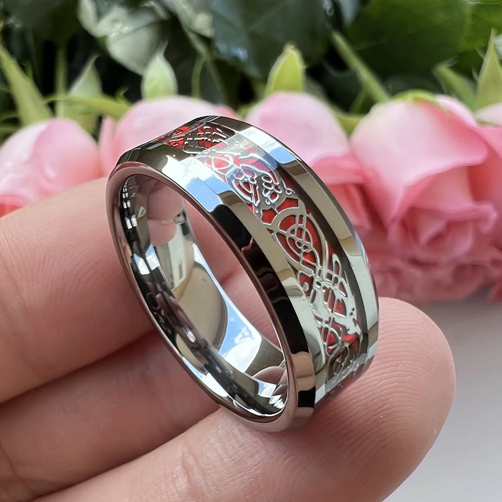 Coolstyle Jewelry 8mm Carbon Fiber Dragon Inlay Beveled Tungsten Ring for Men Women Trendy Engagement Wedding Band Comfort Fit