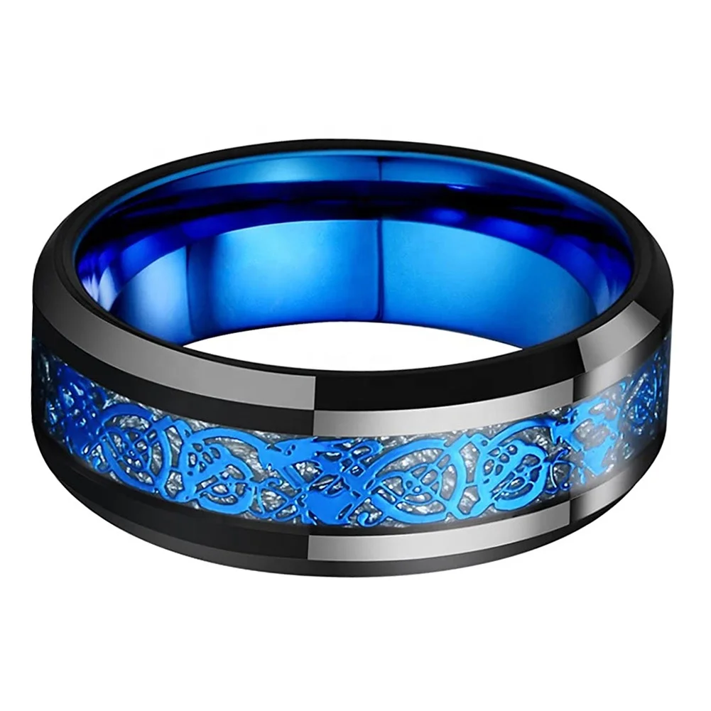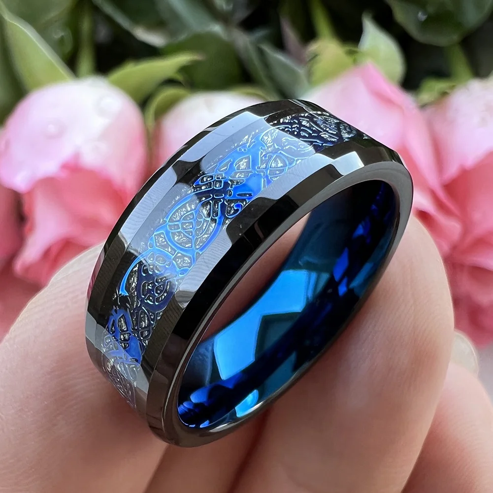 Coolstyle Jewelry 8mm Black Blue Plated Tungsten Men Wedding Band Women Ring Dragon Meteorite Inlay Beveled Edges Comfort Fit