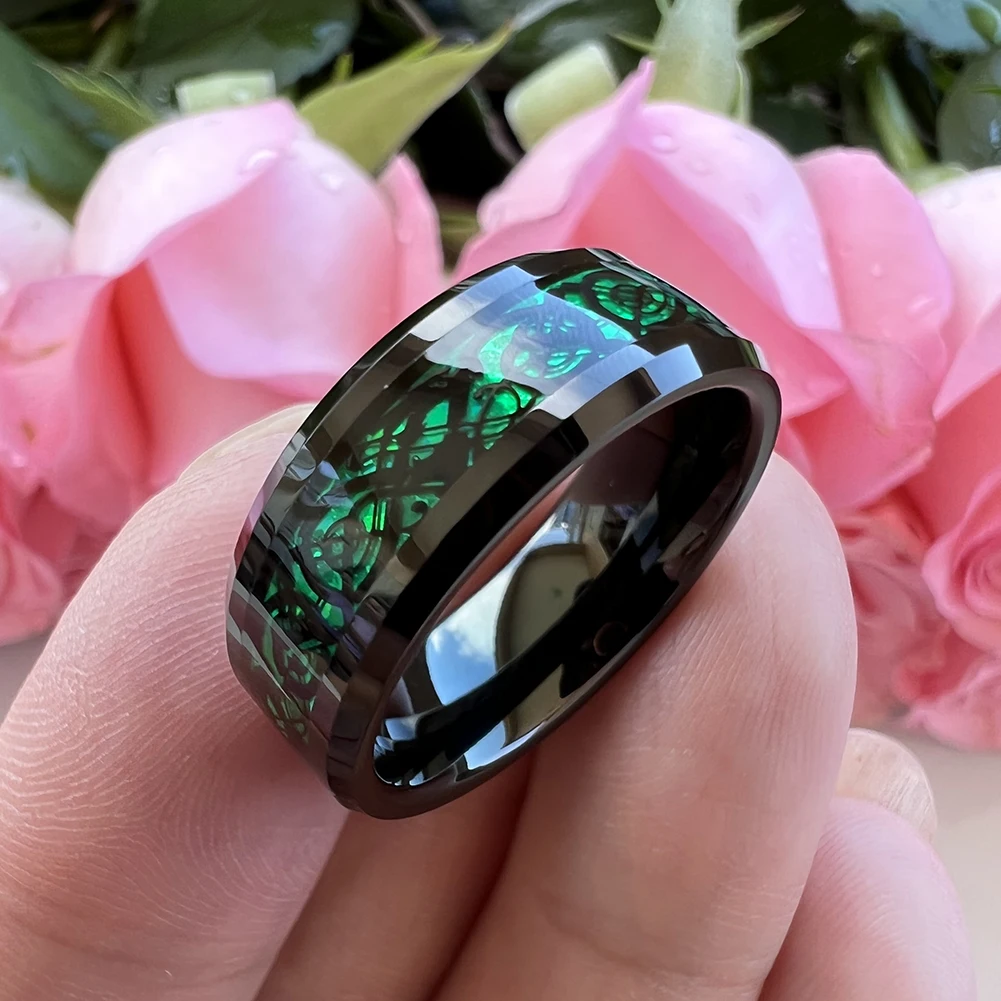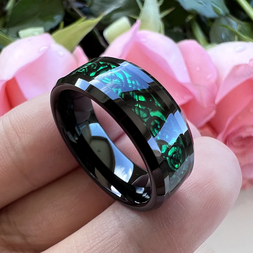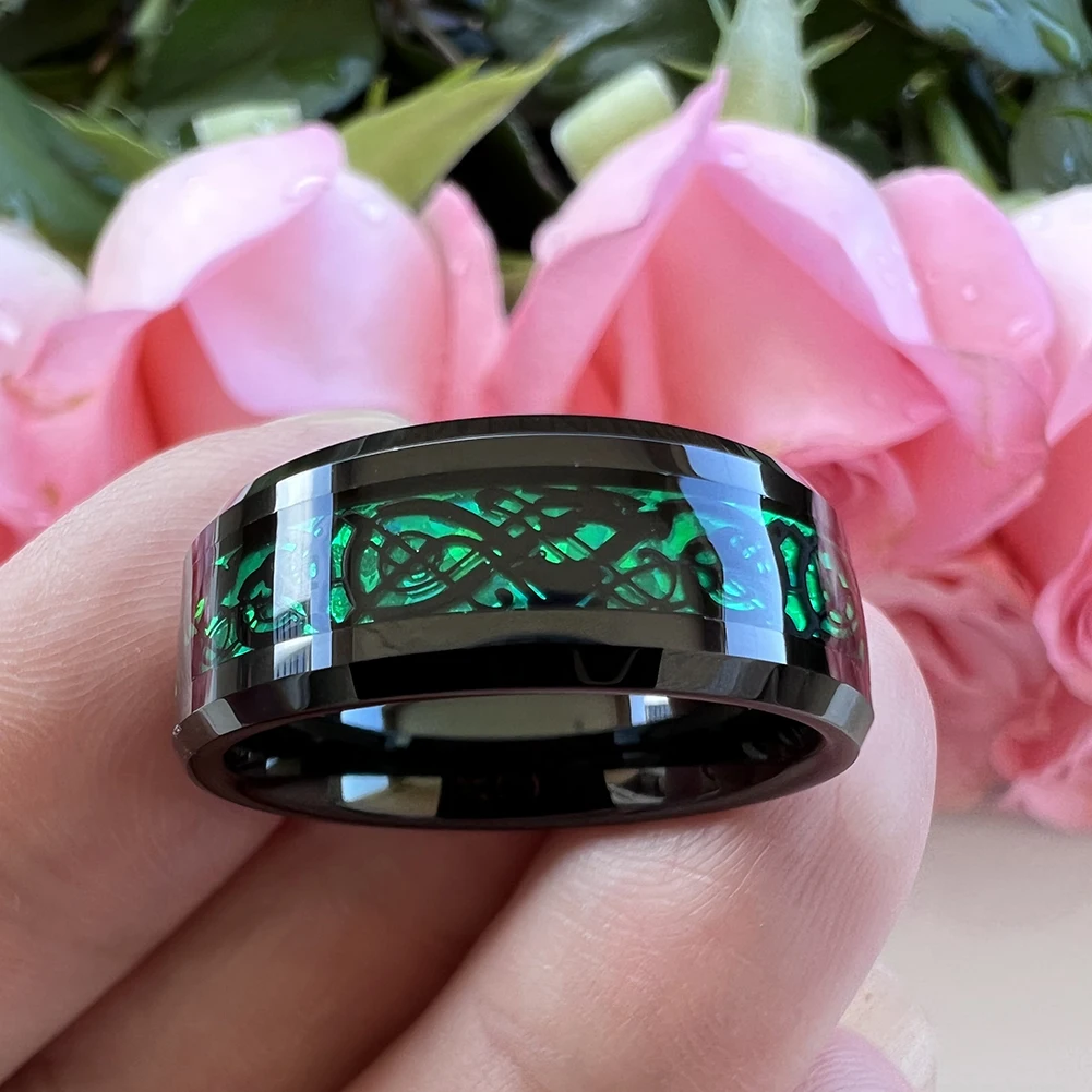 Coolstyle Jewelry 6mm 8mm Carbon Fiber Green Dragon Inlay Black Tungsten Ring Men Women Engagement Wedding Band Comfort Fit
