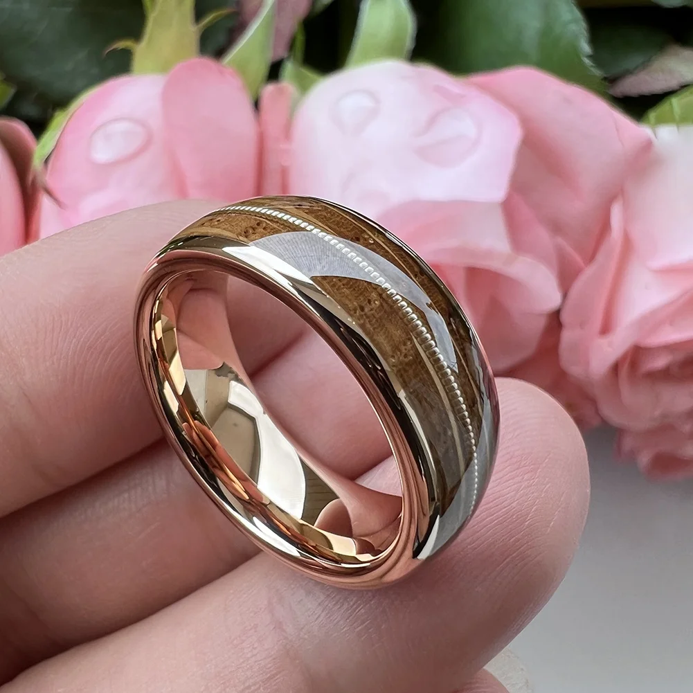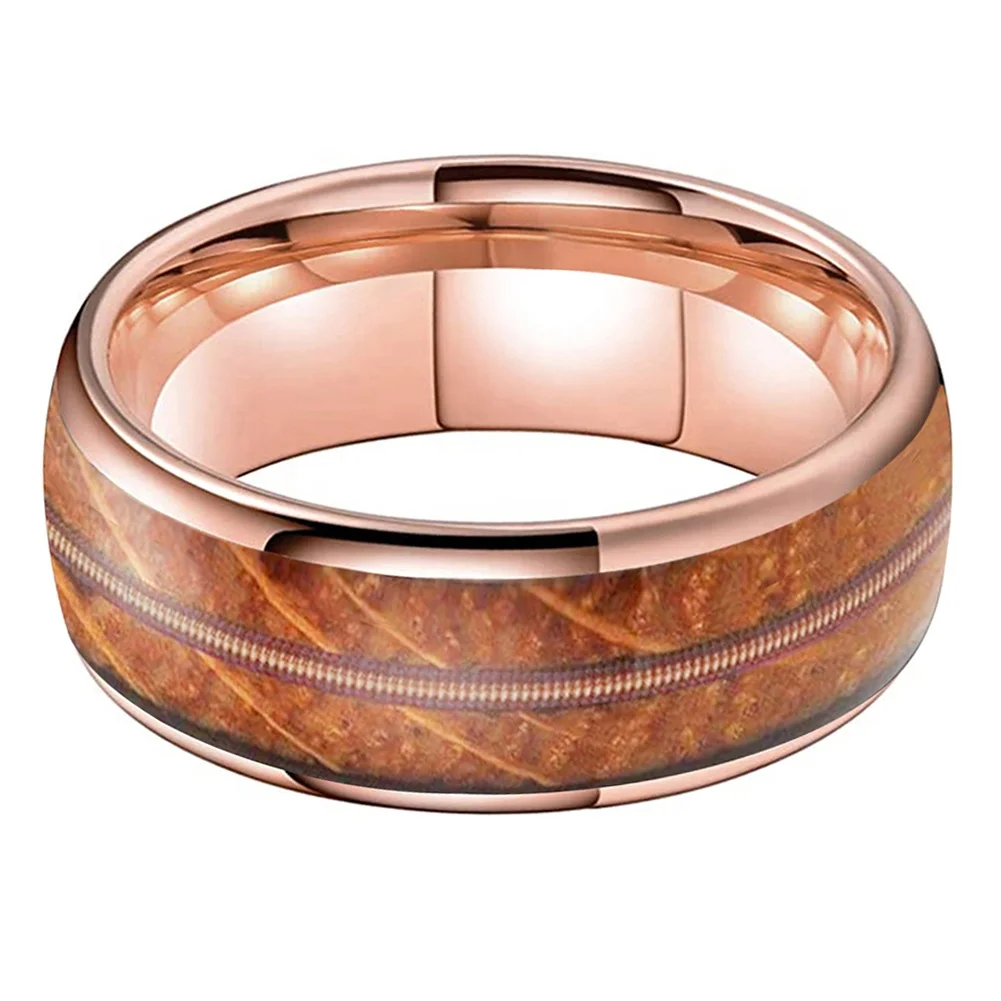 Coolstyle Jewelry 8mm Whisky Barrel Wood Guitar String Inlay Rose Gold Tungsten Ring Men Women Fashion Engagement Wedding Band