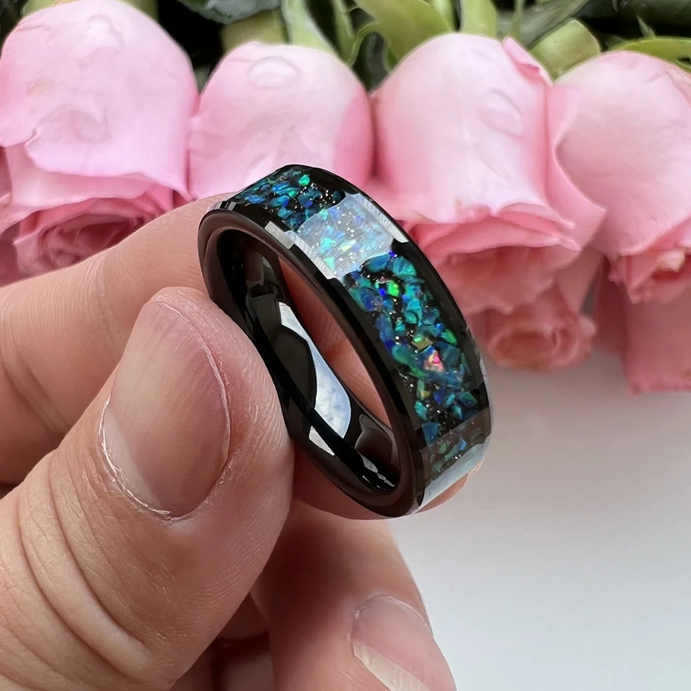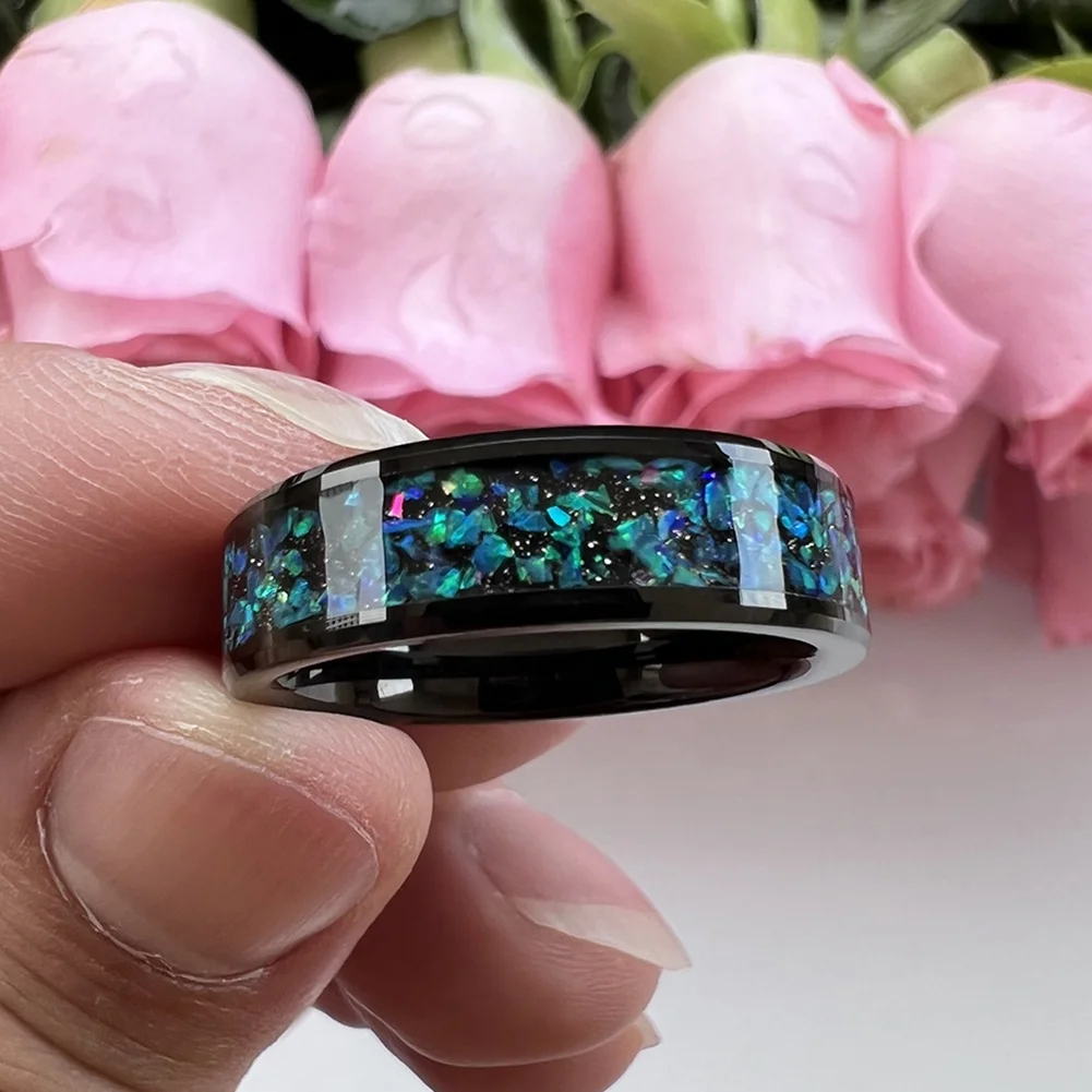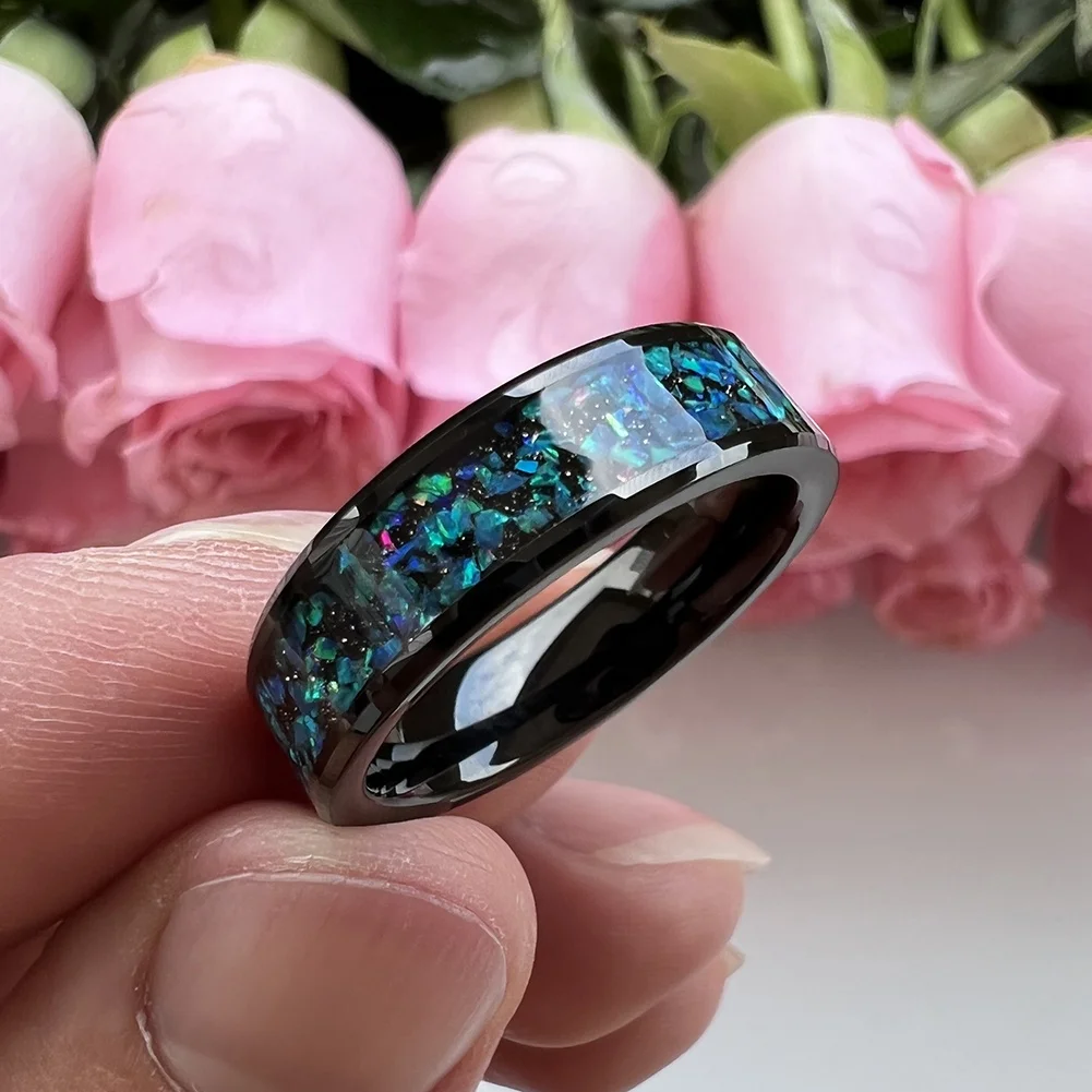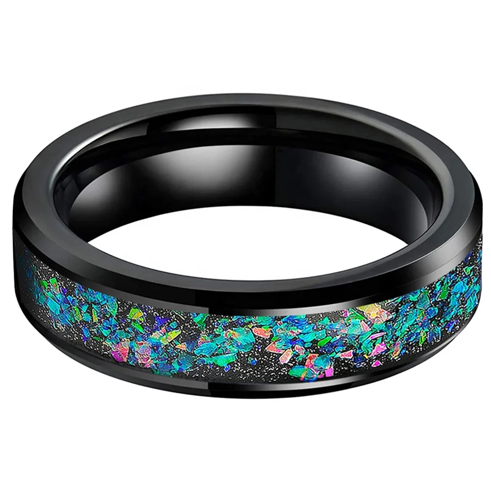 Coolstyle Jewelry Beveled Edges 6mm Black Tungsten Ring for Men Women Galaxy Opal Inlay Fashion Jewelry Engagement Wedding Band