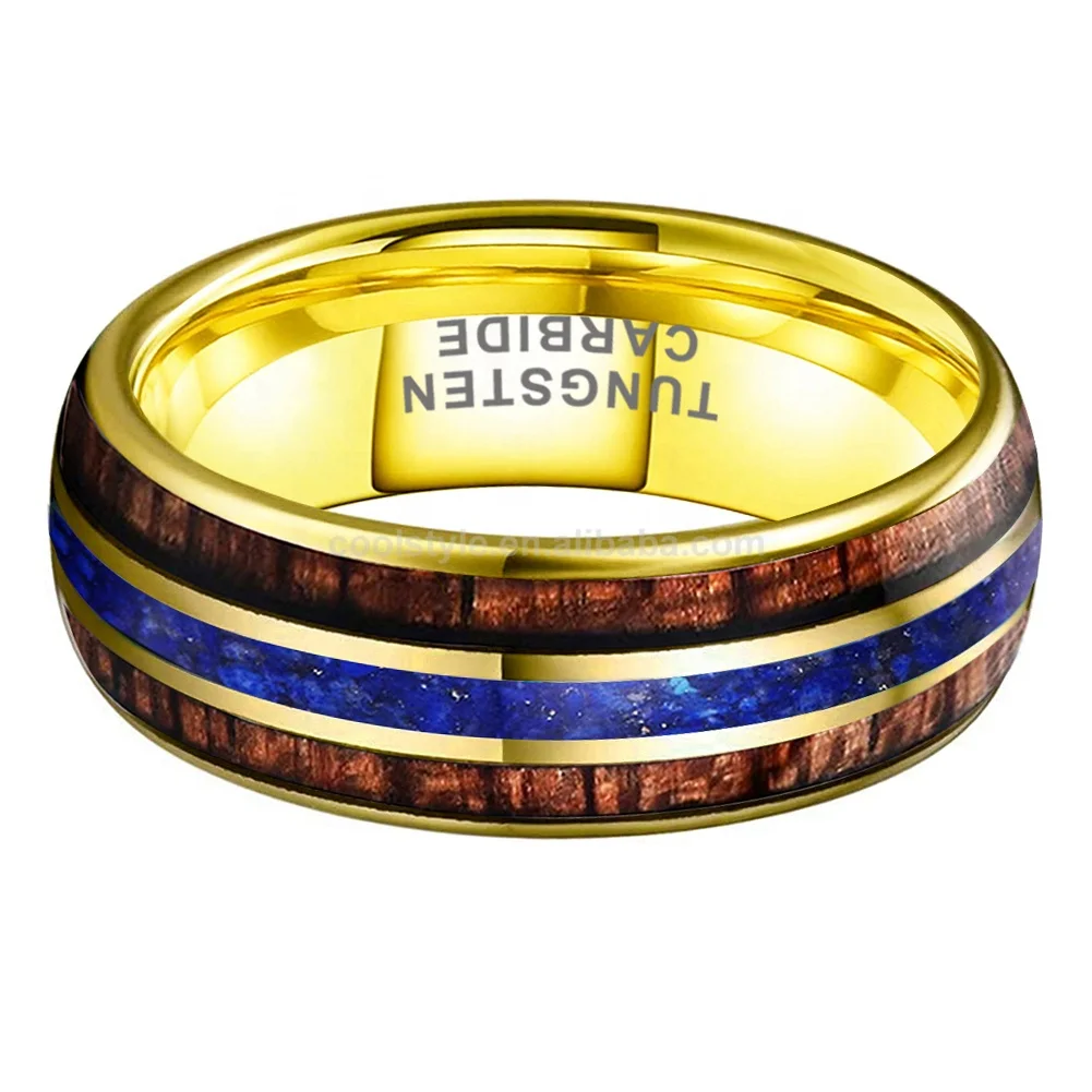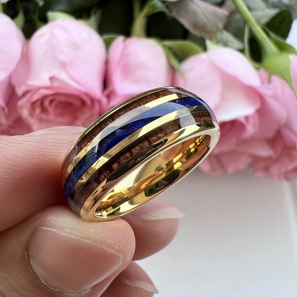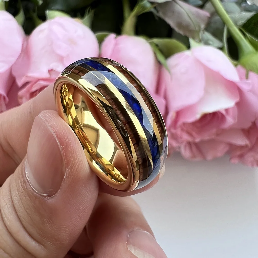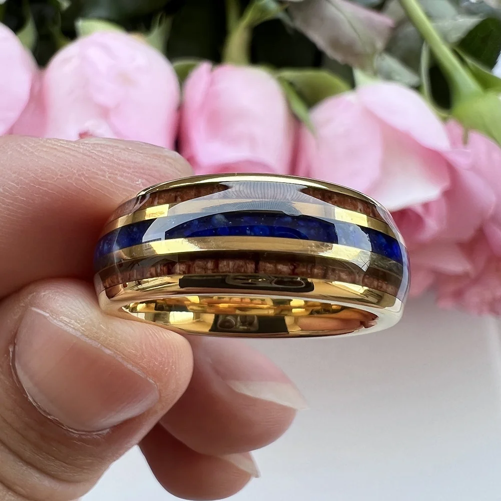 Coolstyle Jewelry 8mm Gold Tungsten Carbide Ring for Men Women Fashion Engagement Wedding Band Lapis Koa Wood Inlay Comfort Fit