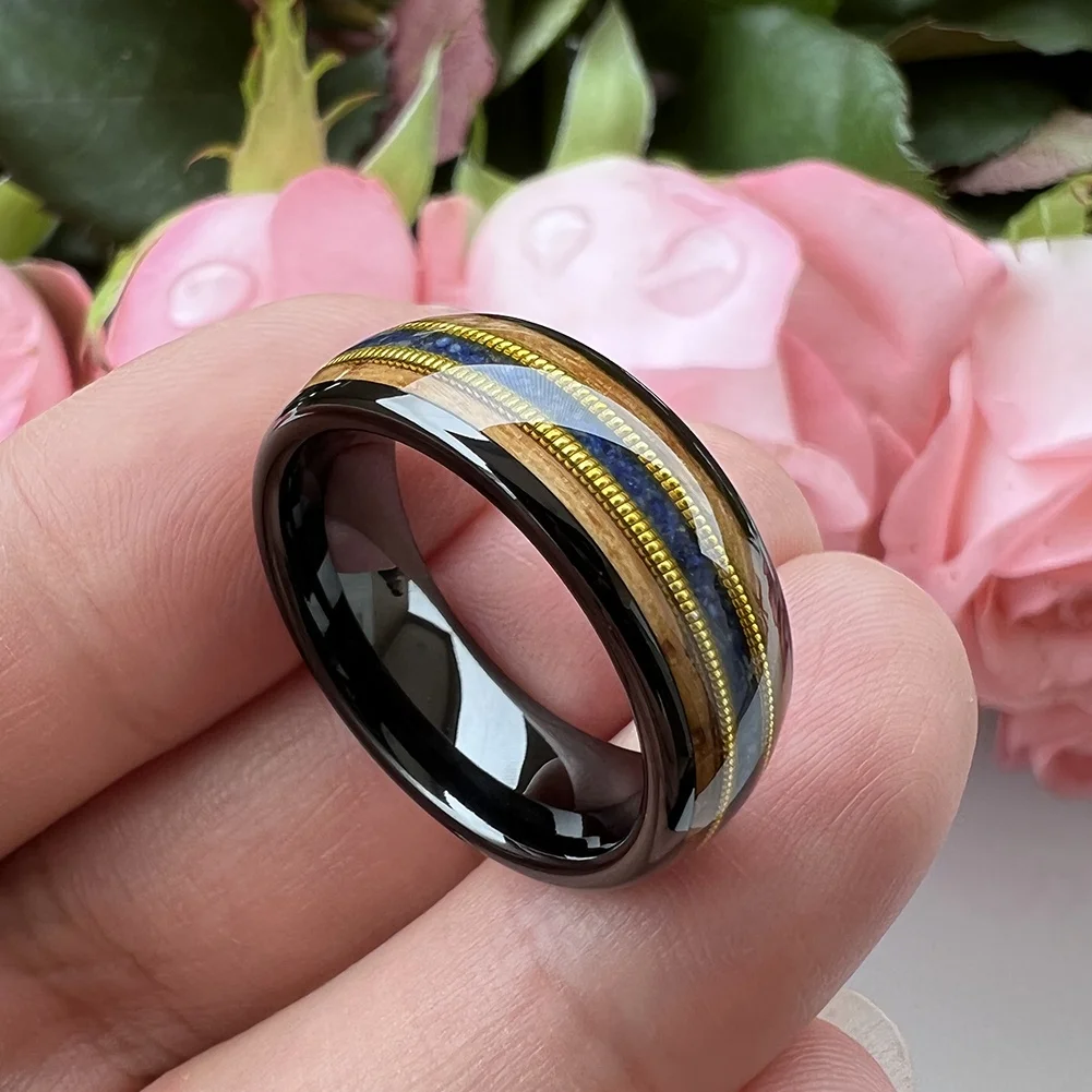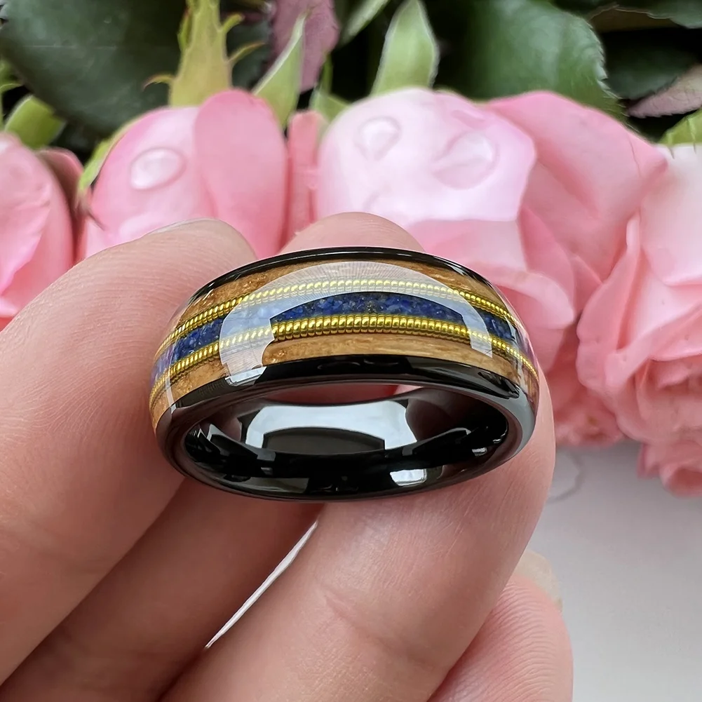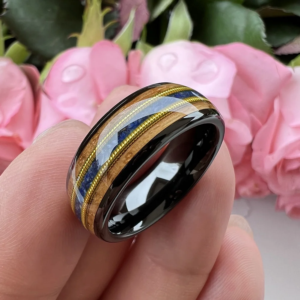 Coolstyle Jewelry 8mm Whisky Wood Guitar String Lapis Inlay Black Tungsten Ring for Men Women Fashion Engagement Wedding Band