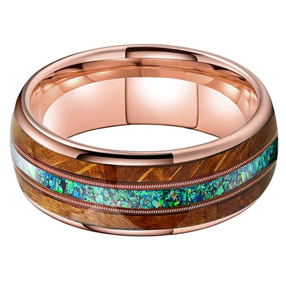 Coolstyle Jewelry 8mm Whisky Wood Guitar String Green Opal Inlay Rose Gold Tungsten Ring for Men Women Engagement Wedding Band