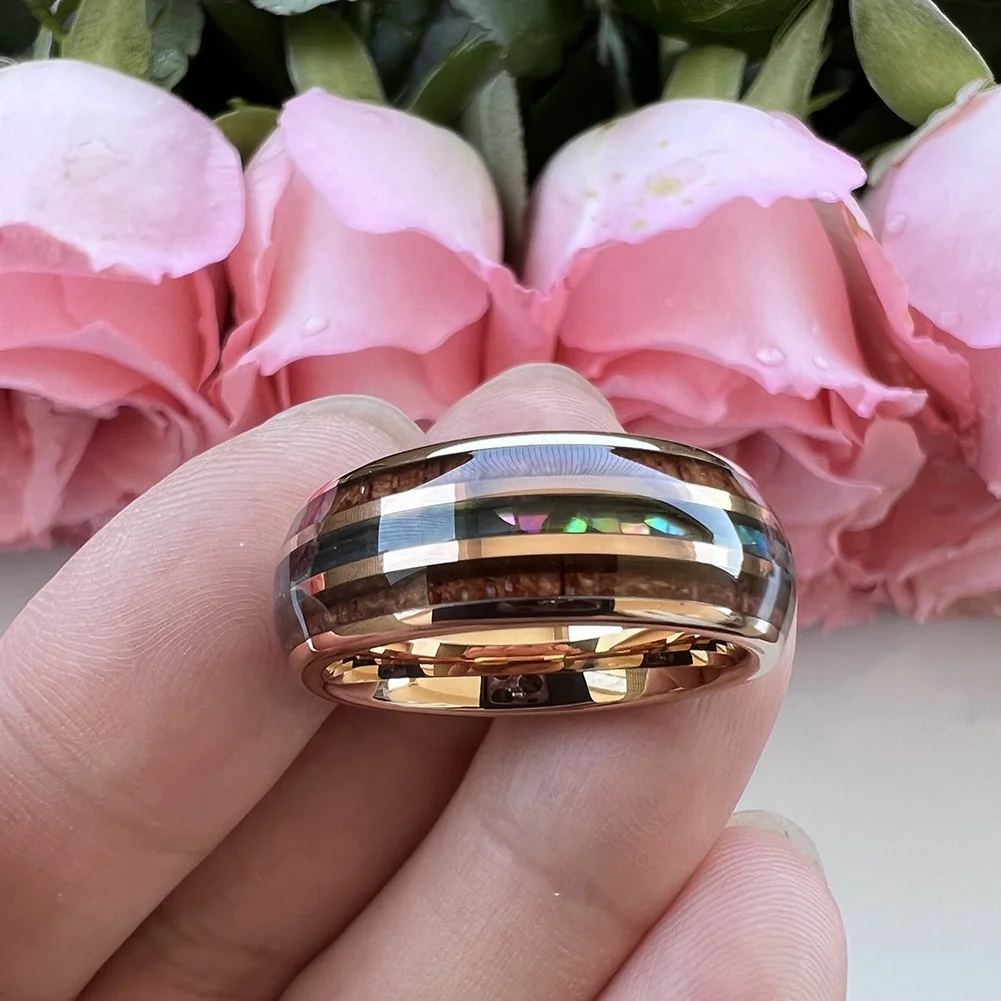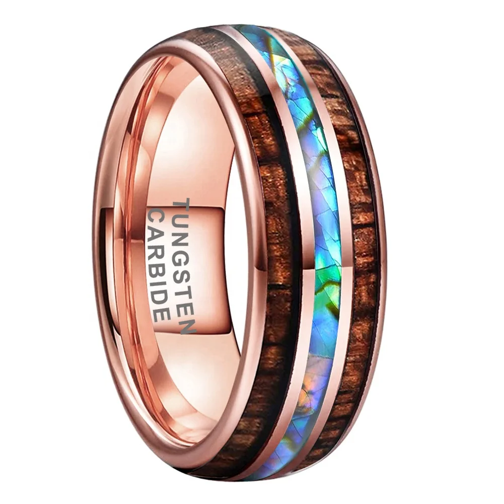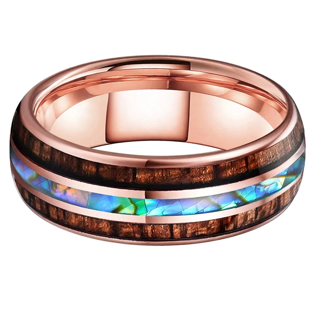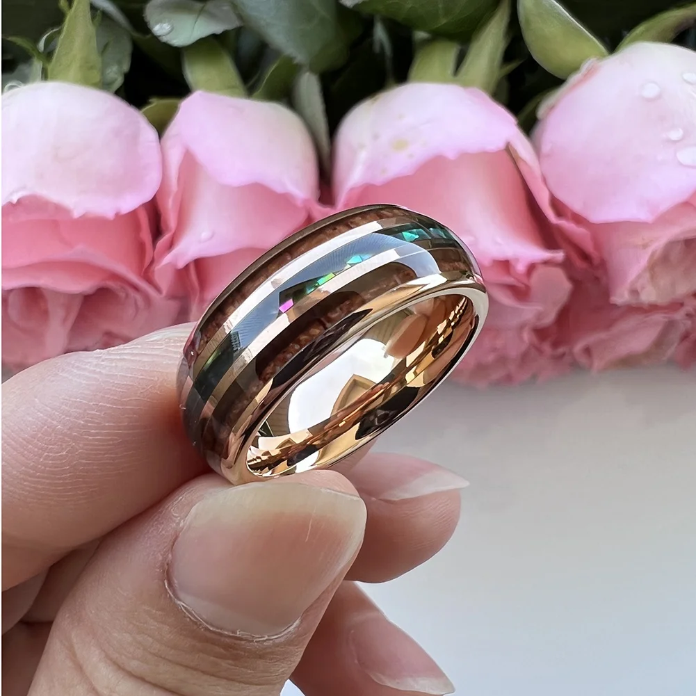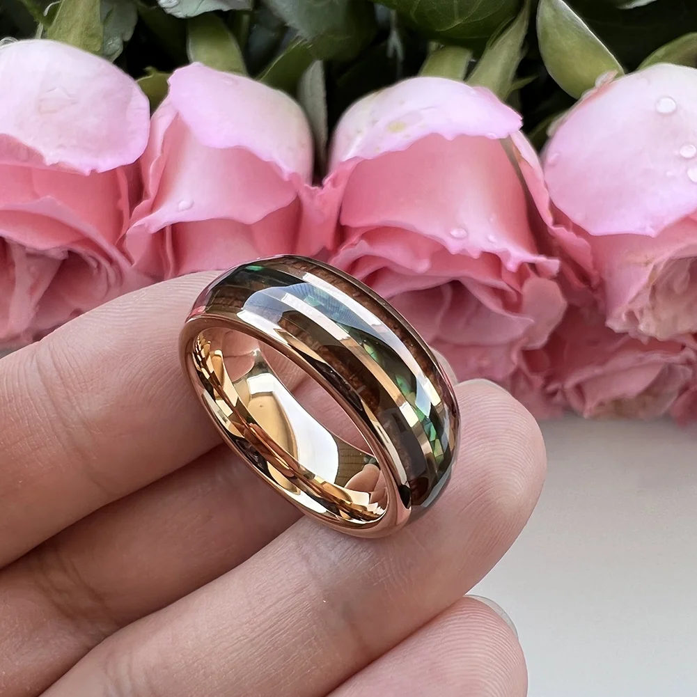 Coolstyle Jewelry 8mm Men Women Rose Gold Tungsten Ring Abalone Shell Koa Wood Inlay Fashion Jewelry Engagement Wedding Band