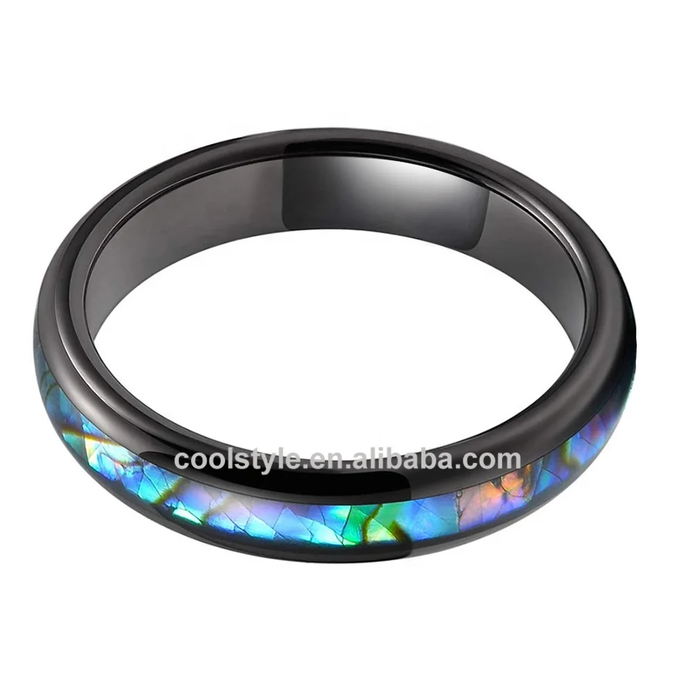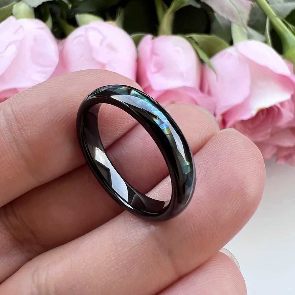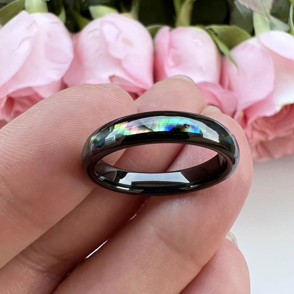 Coolstyle Jewelry 4mm Black Tungsten Carbide Ring for Women Engagement Band Abalone Shell Inlay Polished Shiny Domed Comfort Fit