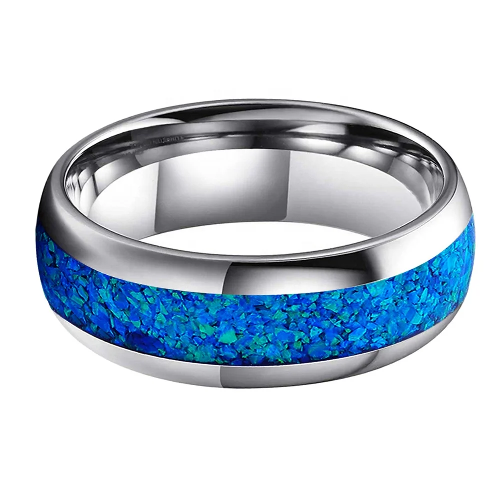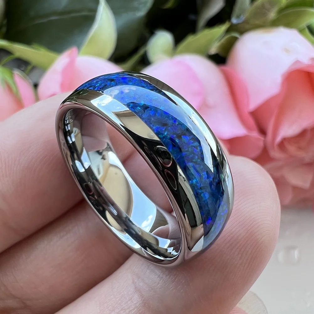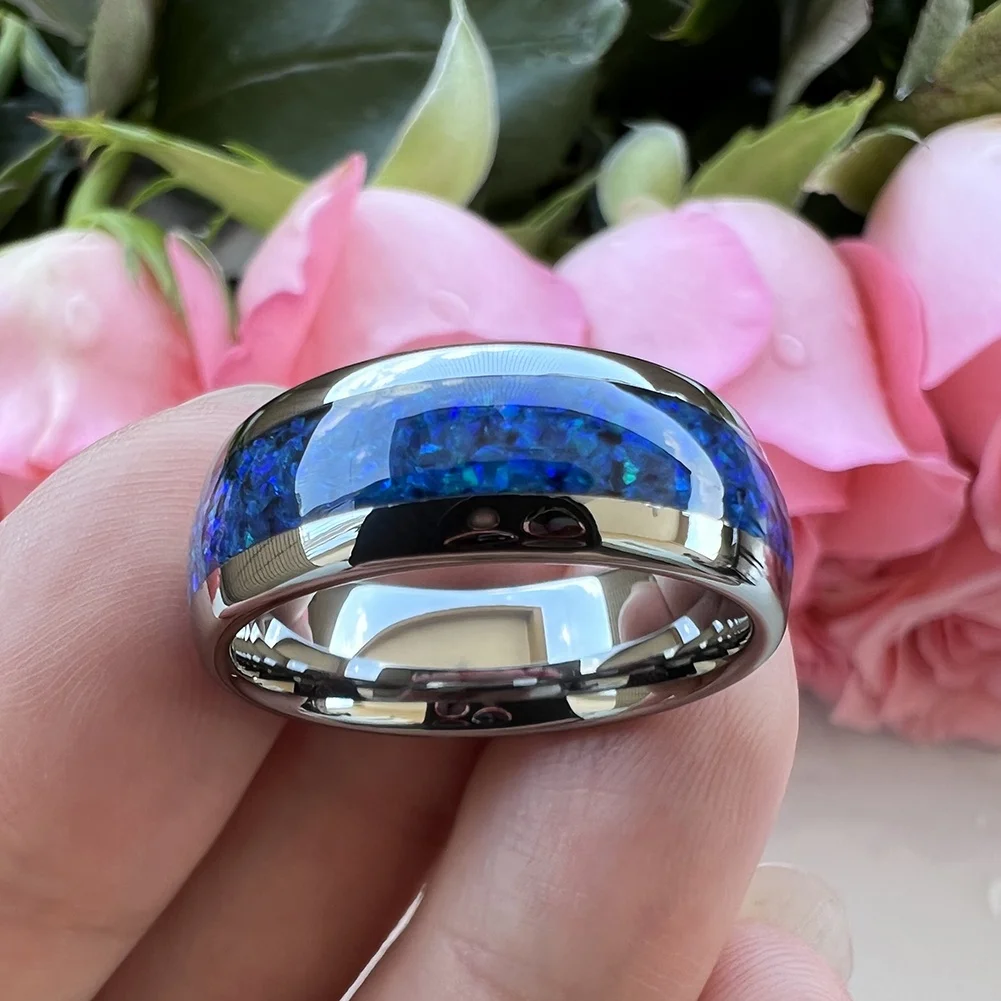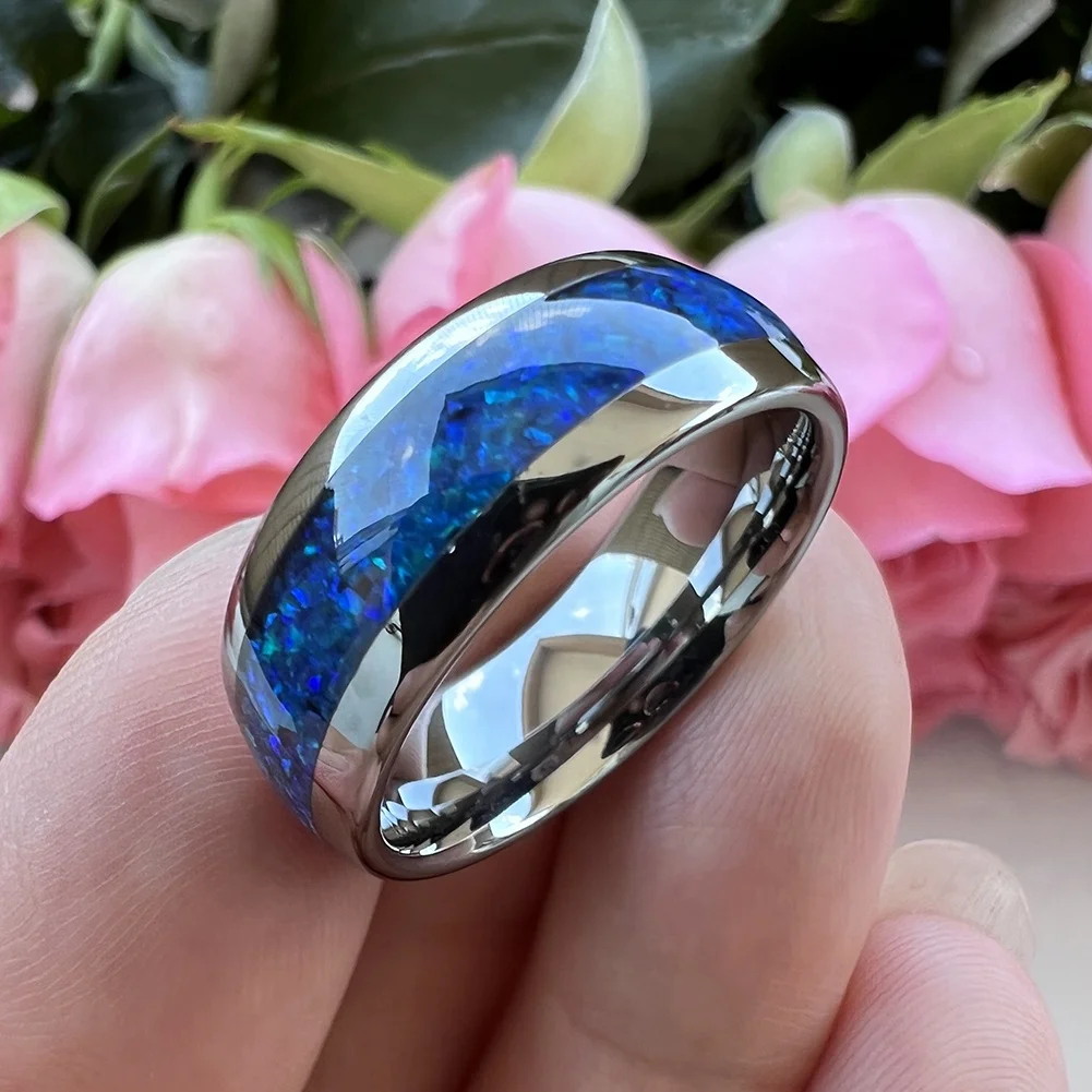 Coolstyle Jewelry 8mm Tungsten Carbide Ring for Men Women Fashion Engagement Wedding Band Blue Opal Inlay Polished Comfort Fit