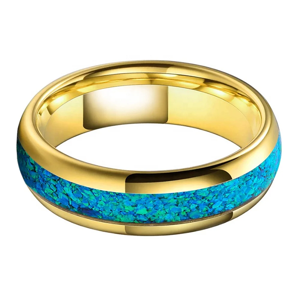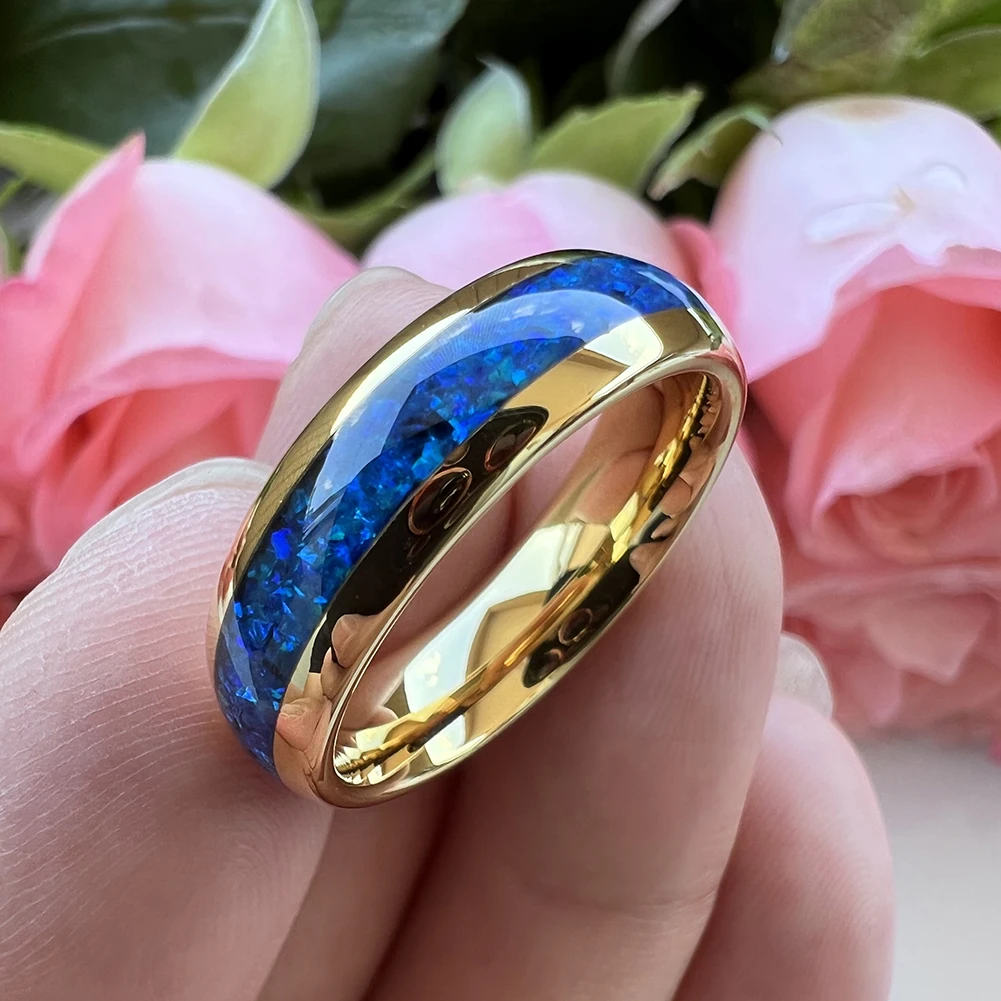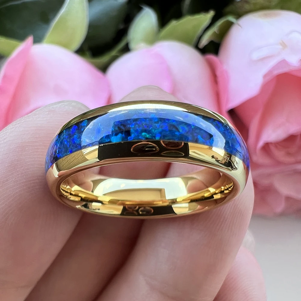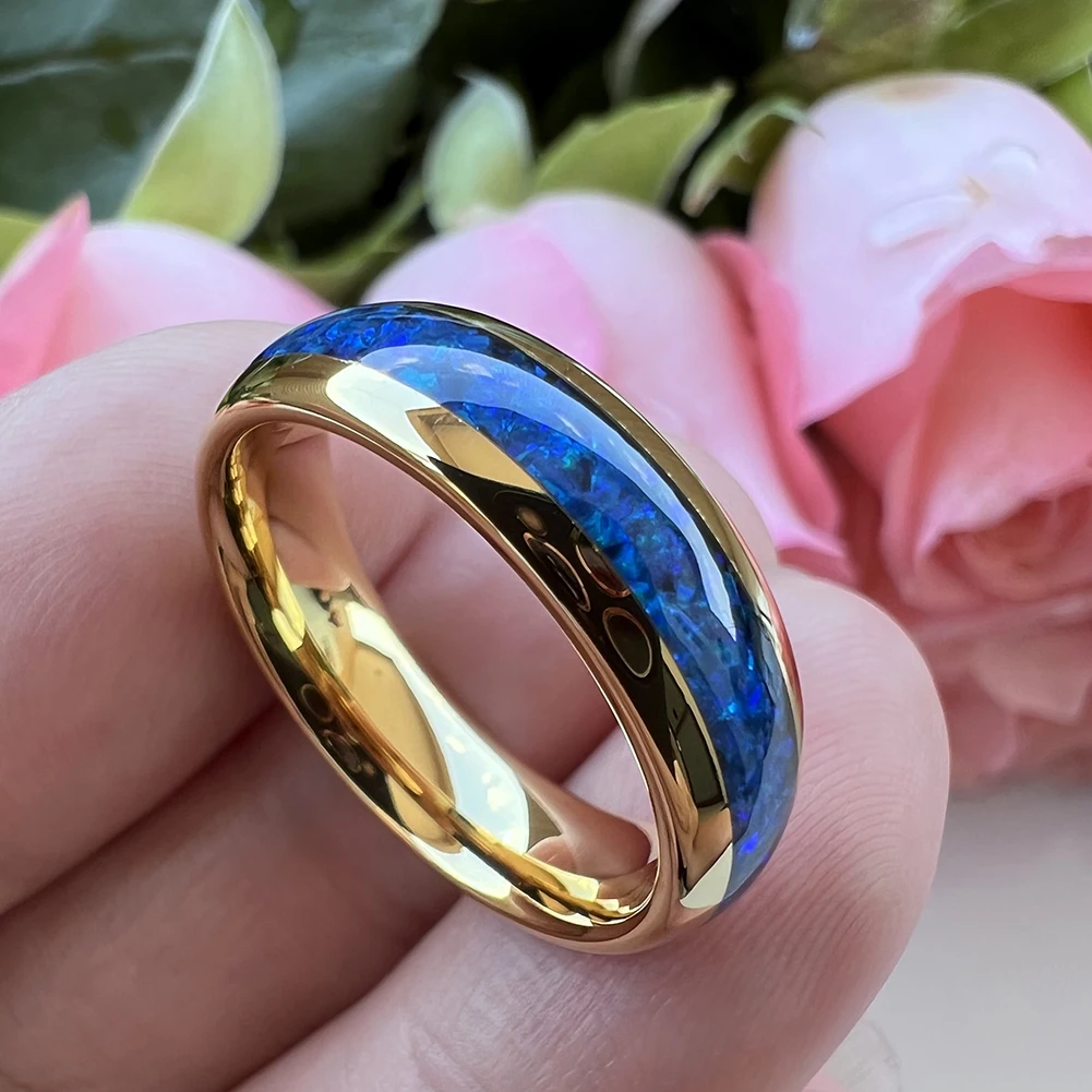 Coolstyle Jewelry 6mm Gold Tungsten Carbide Ring for Men Women Engagement Wedding Band Blue Opal Inlay Polished Comfort Fit
