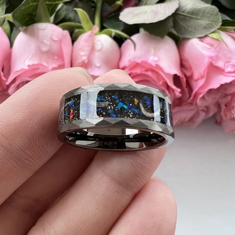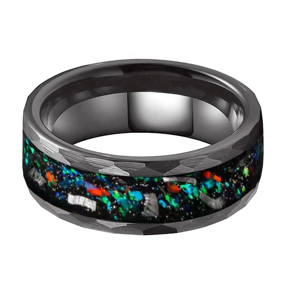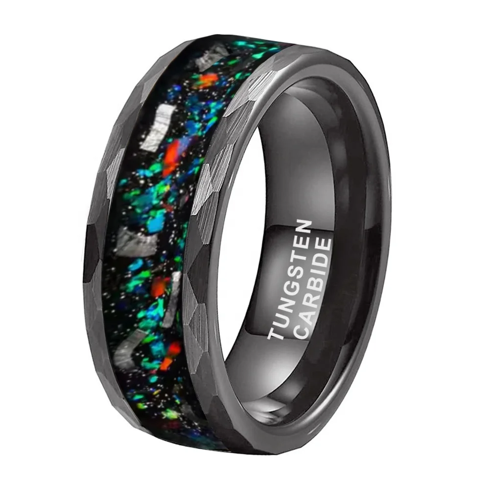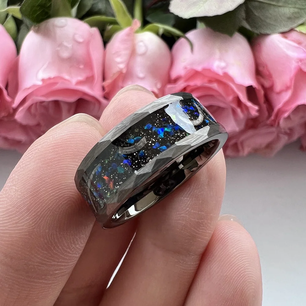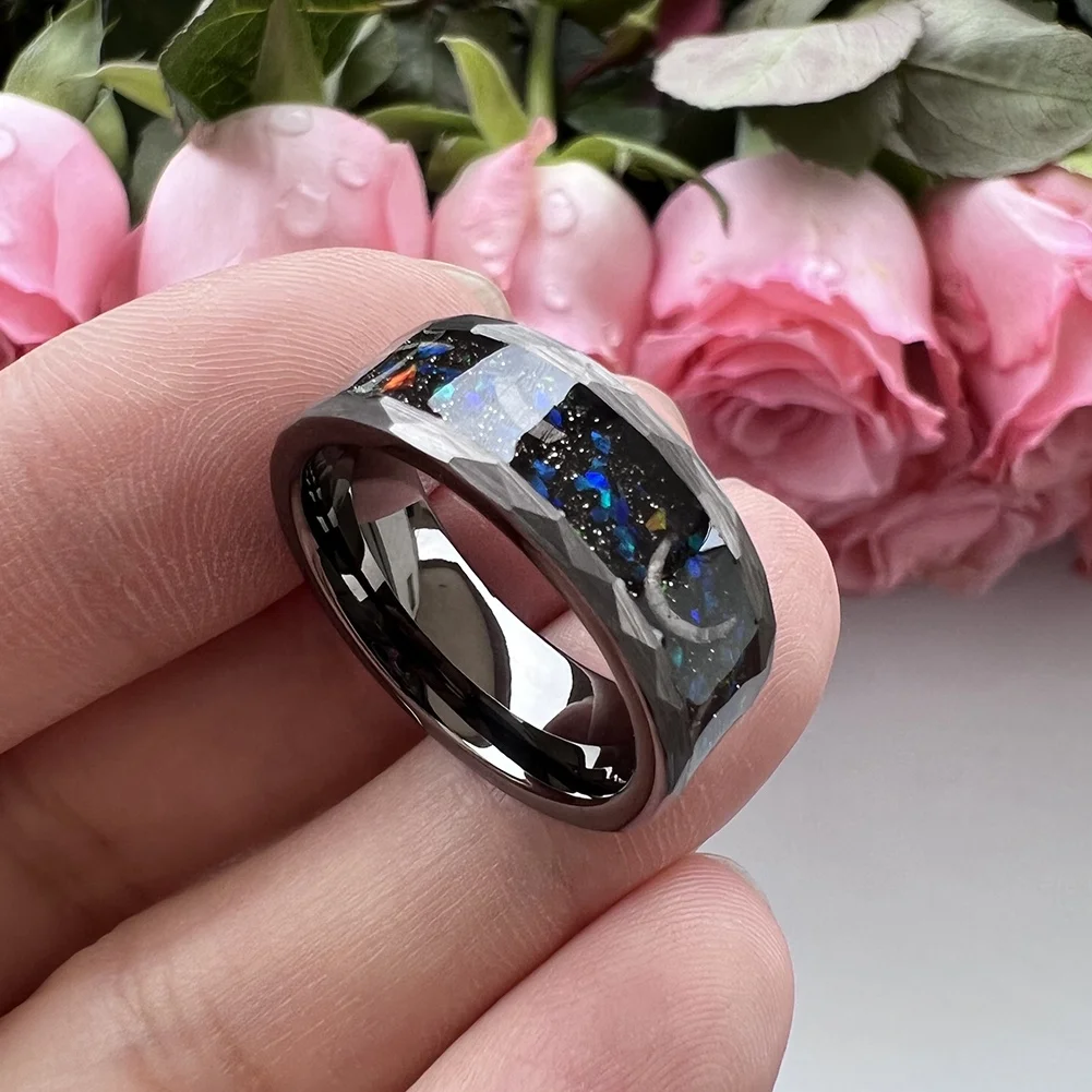 Coolstyle Jewelry 8mm Gunmetal Hammered Tungsten Ring for Men Women Real Meteorite Galaxy Opal Inlay Engagement Wedding Band