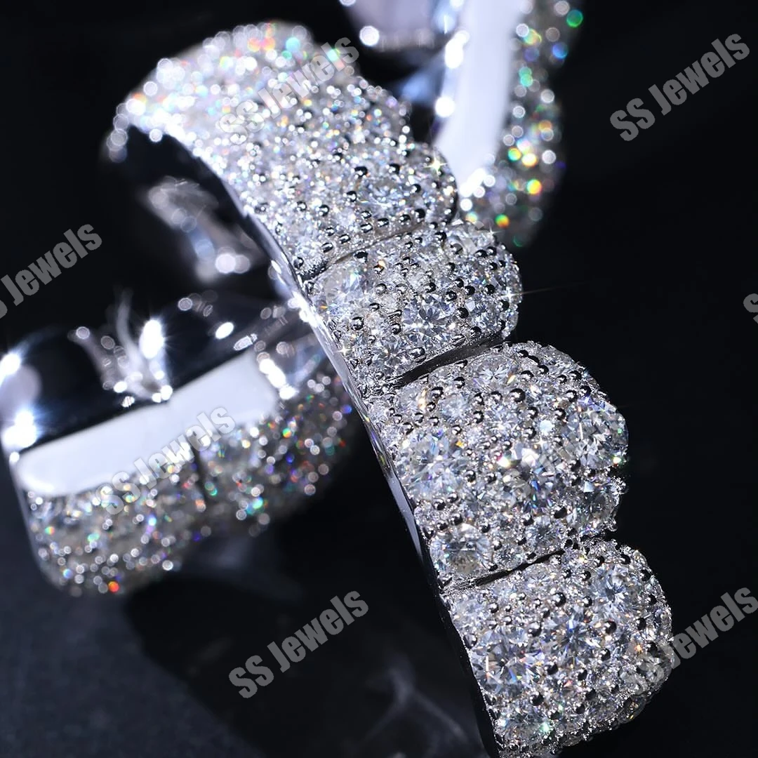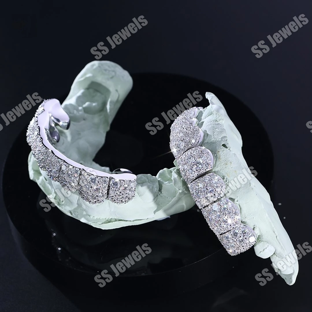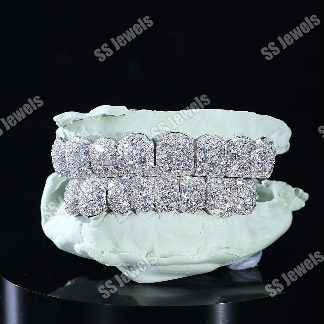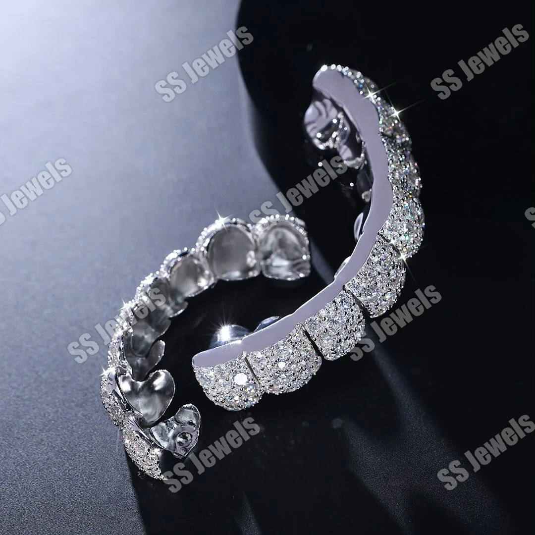 925 Sterling Silver Unisex 16 Teeth Grillz Top & Bottom Mouth Mosaic Setting Rhodium Plated Moissanite Fine Jewelry