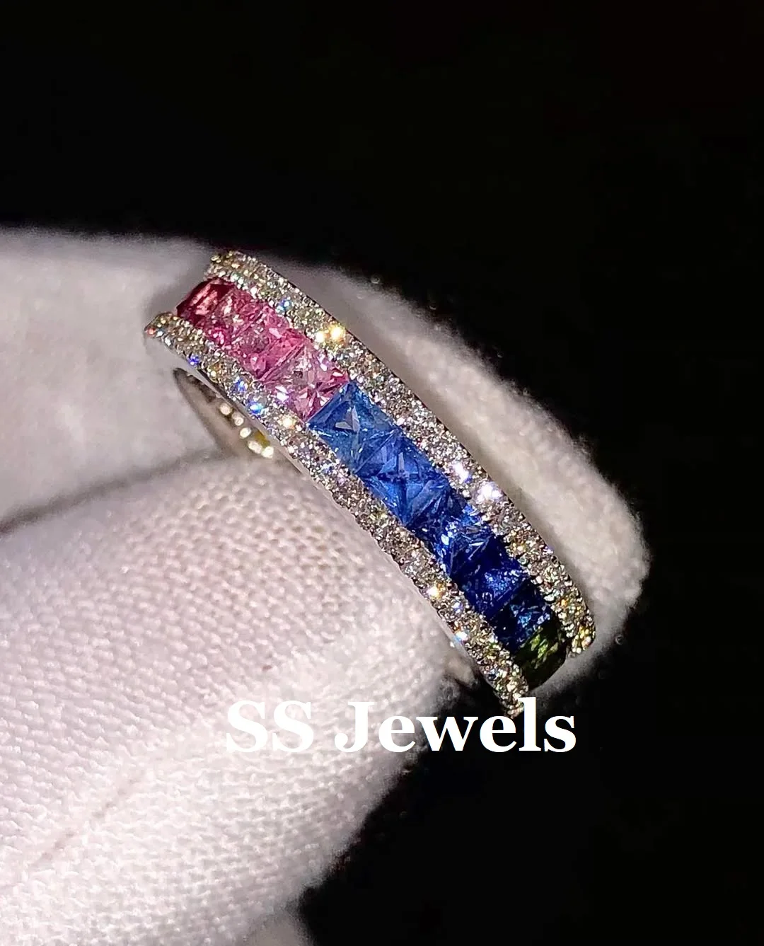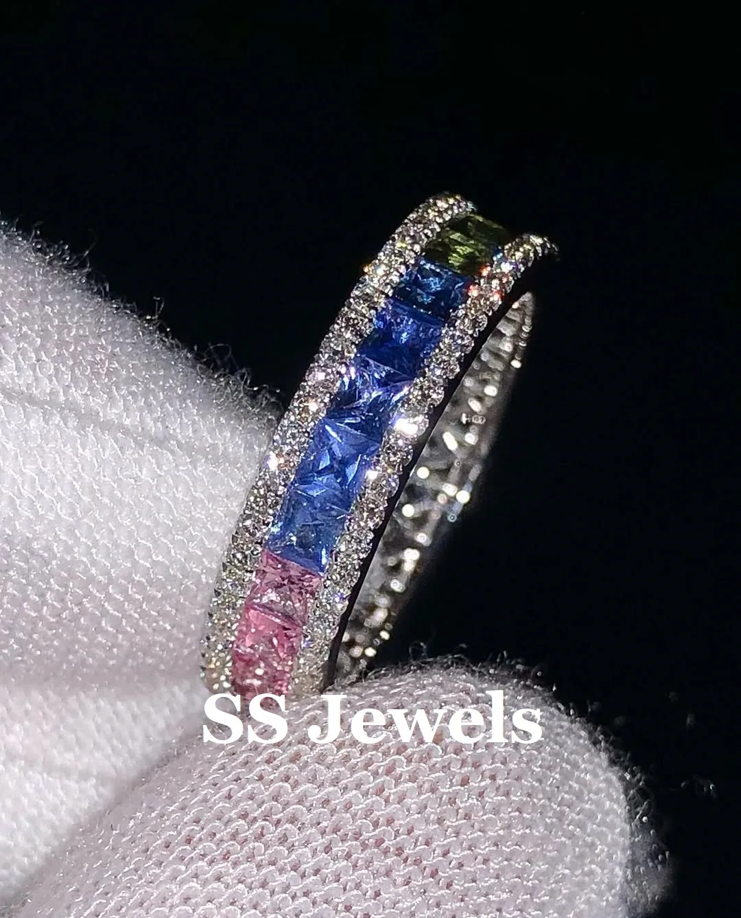 Unisex High Quality 925 Sterling Silver Wedding Band Multi-Color Gemstone Channel Set Princess Cut Moissanite Rhodium Rings
