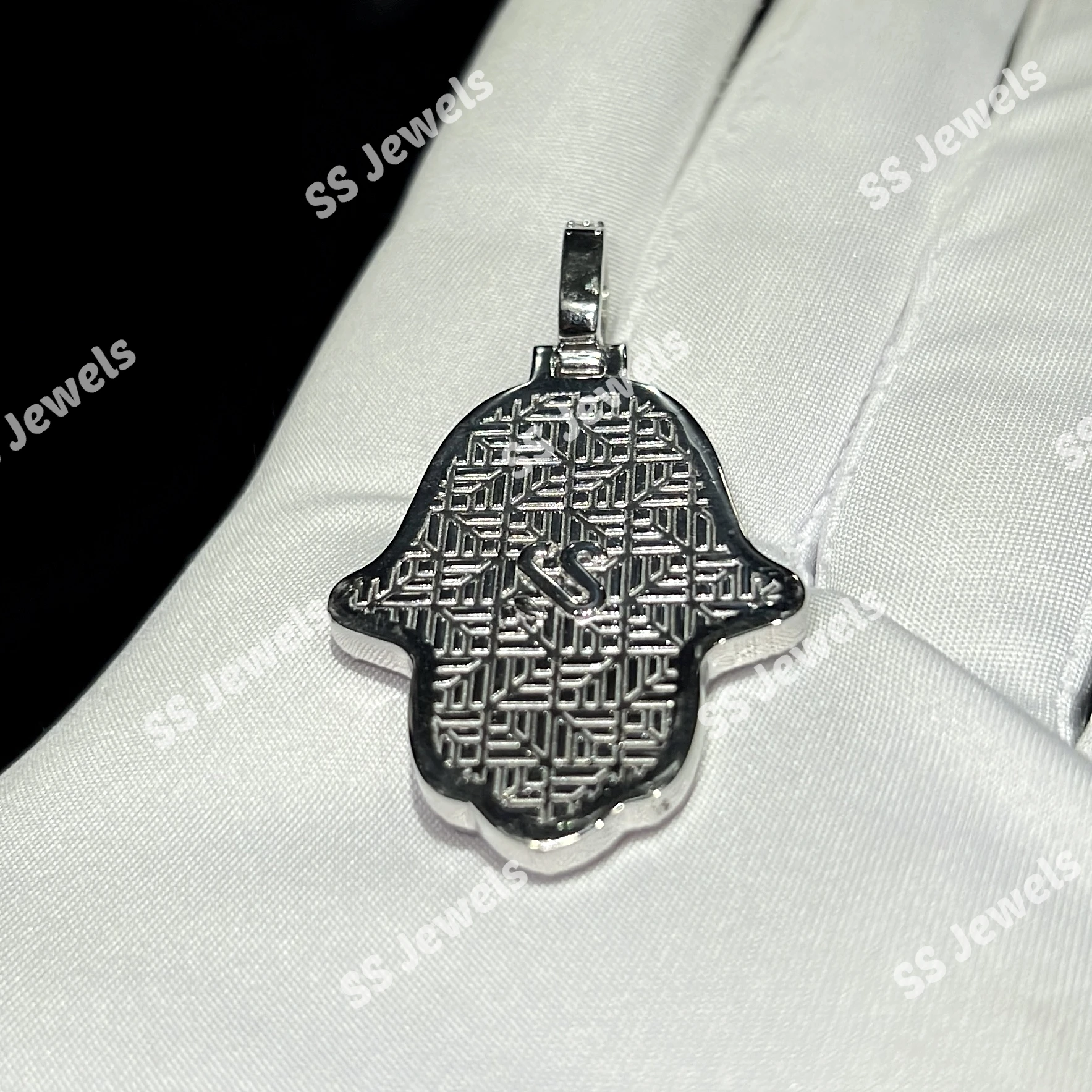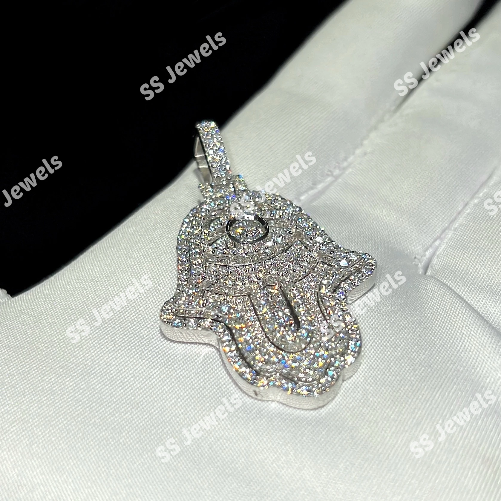 Unisex Ice Moissanite Brilliant Cut Hamsa Hand Claw Setting Trendy Pendant Charm Necklace 925 Silver Rhodium Plated Christian